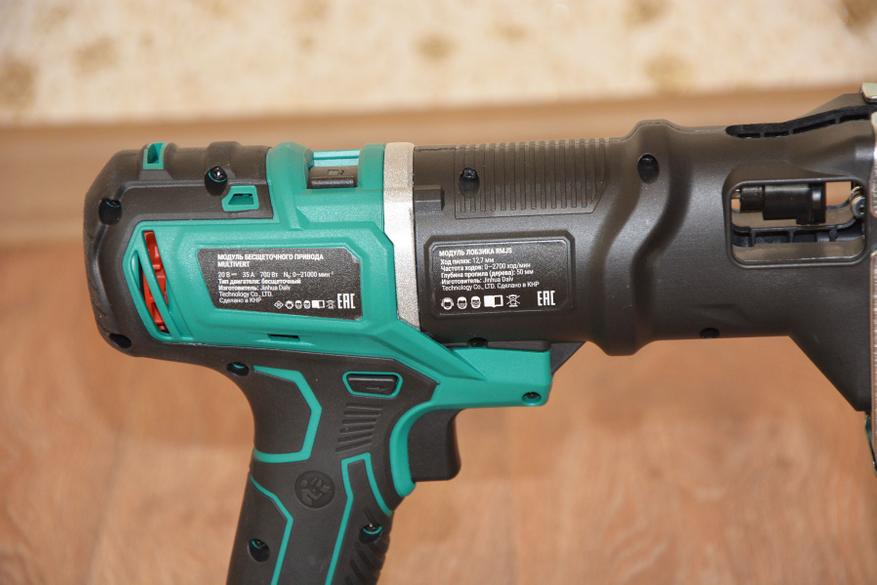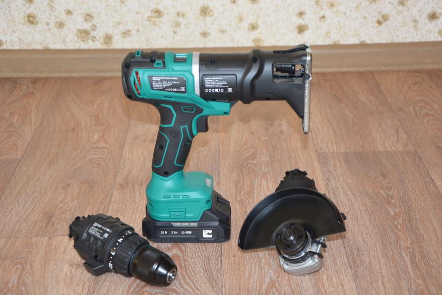 Теперь осмотрим модули. Корпуса выполнены из прочного пластика, что снижает общий вес мультиверта и сохраняет правильную балансировку инструмента. Так лобзик весит 538 грамм, болгарка — 833, дрель — 658 грамм.