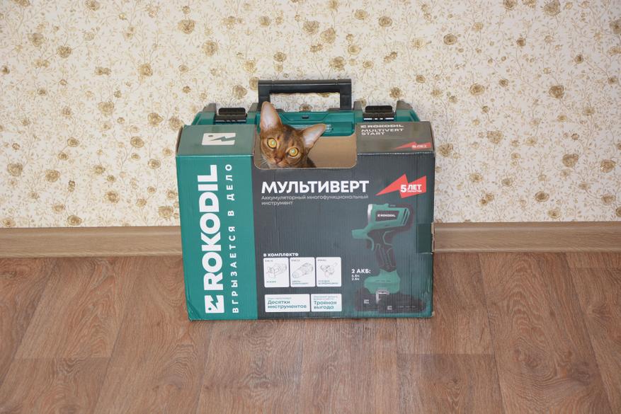 Реализуется мультиверт в коробке с вырезом под рукоятку кейса для удобства переноски сразу из магазина. Пояснения на коробке дают представление о возможностях инструмента, его достоинствах, комплектации. Особенно стоит отметить гарантийный срок службы — 5 лет, что совсем немало в наше время. Тем более, что речь идет о пяти годах интенсивного использования. В домашних же условиях этот срок пролонгируется еще на несколько лет.