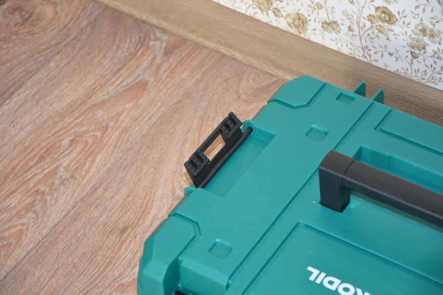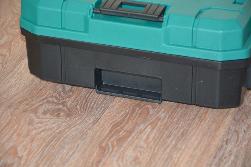 Увесистый кейс для хранения выполнен из прочного и толстого пластика с элементами жесткости. Оснащен двумя откидными рукоятками для выбора способа переноски одной рукой, двумя нишами по бокам в нижней части для переноски обеими руками (удобно поставить на полку), проушиной для замка от воровитых индивидуумов. Под вставку из прозрачного пластика можно вложить записку, например, со своей фамилией. Замки кейса сделаны из металла, что в данном случае куда надежнее пластика. Кроме того, по бокам крышки есть две откидные проушины, видимо, для крепления кейса ремнем во время транспортировки.