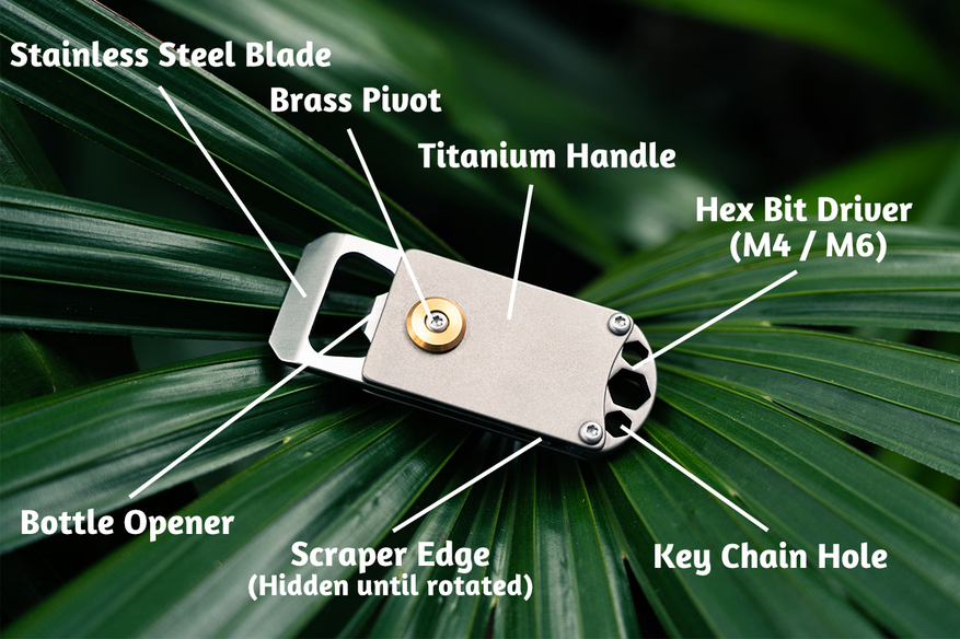 Полезные брелоки для ежедневного применения приобретают самые разнообразные формы и включают порой неожиданные инструменты. Стартап из Гонконга Corebit представил на площадке «Кикстартер» EDC-брелок на 5 функций, среди которых нож для чистки фруктов и овощей. Инструменты мультитула выполнены из нержавеющей стали, а накладки корпуса из титана.