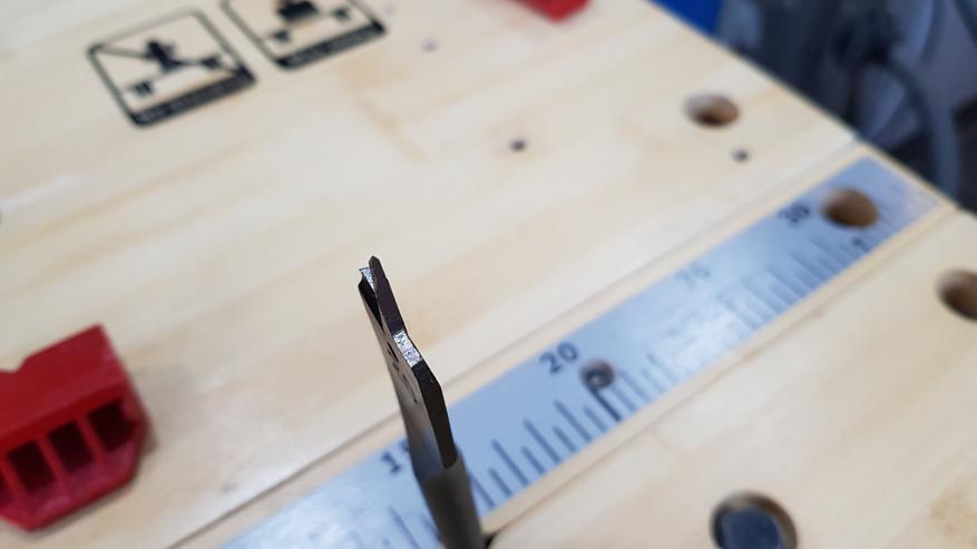 Типичная проблема видна на фотографии ниже, при работе сверло, из-за плохой заточки, может упереться в материал, после чего обычный шуруповерт делает из него спиральное, причем спираль не в ту сторону. Таких случаев было несколько, стоит встретиться сучку и вот оно. Сделаны они похоже из какого-то пластилина, они кстати легко возвращаются к плоскому состоянию в тисках.