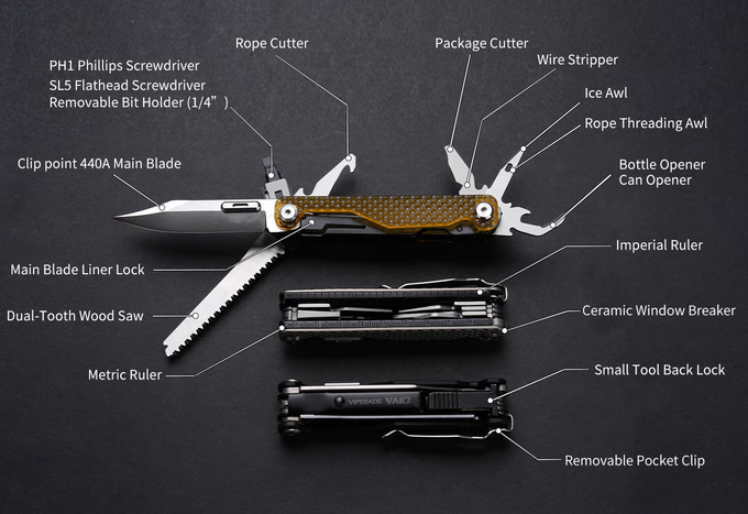 Пила, битодержатель, резак для канатов, отвертка, стеклобой шило и обычный клинок — китайский мультитул Viperade VAK7 успешно начал кампанию по сбору средств на Kickstarter. Инструмент доступен в различных материалах корпуса, включая титановый сплав и инженерный пластик.