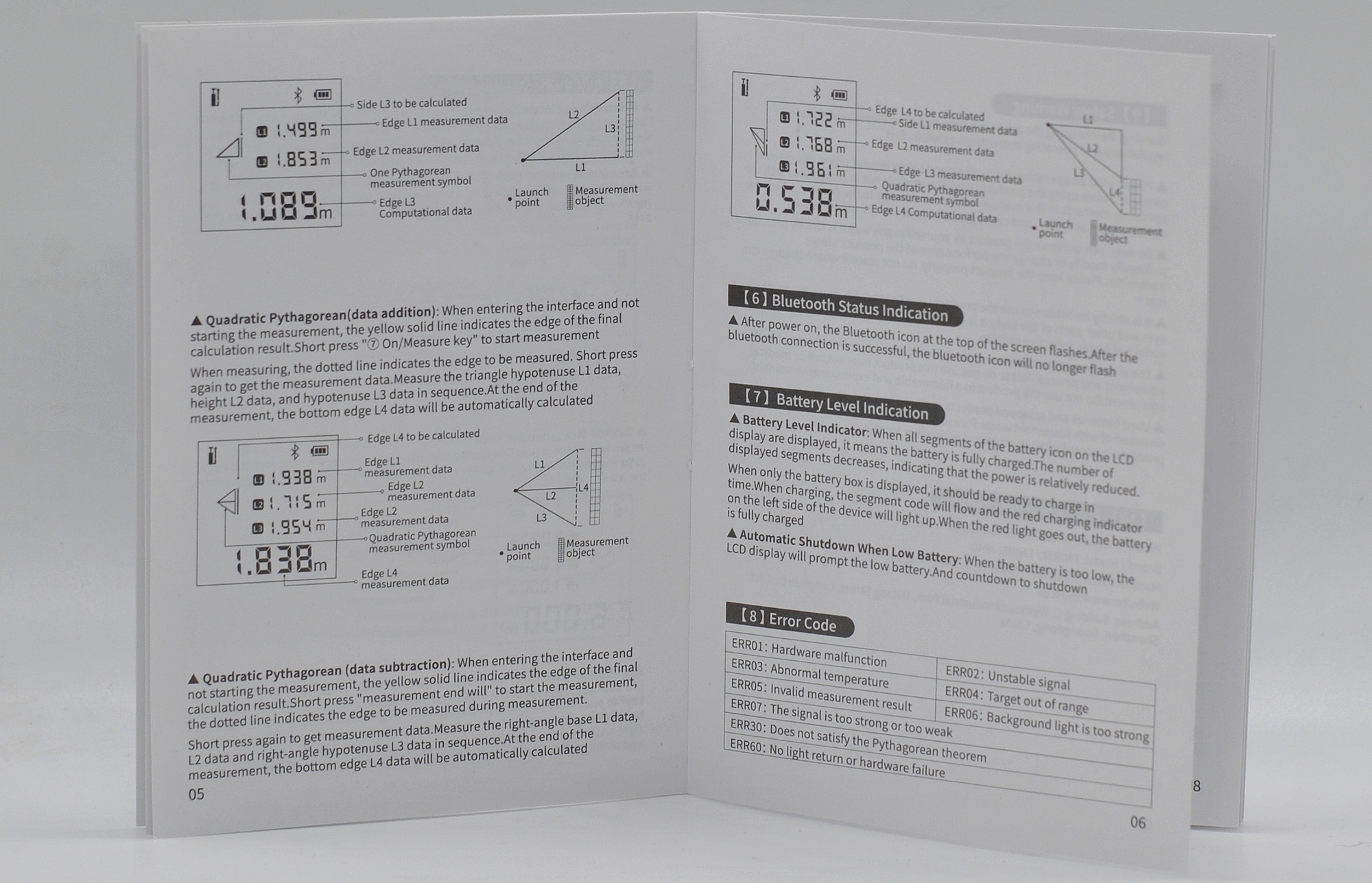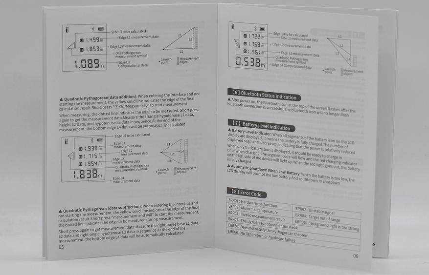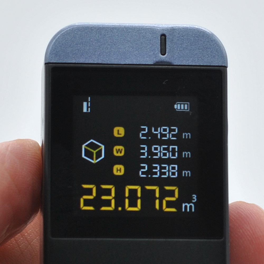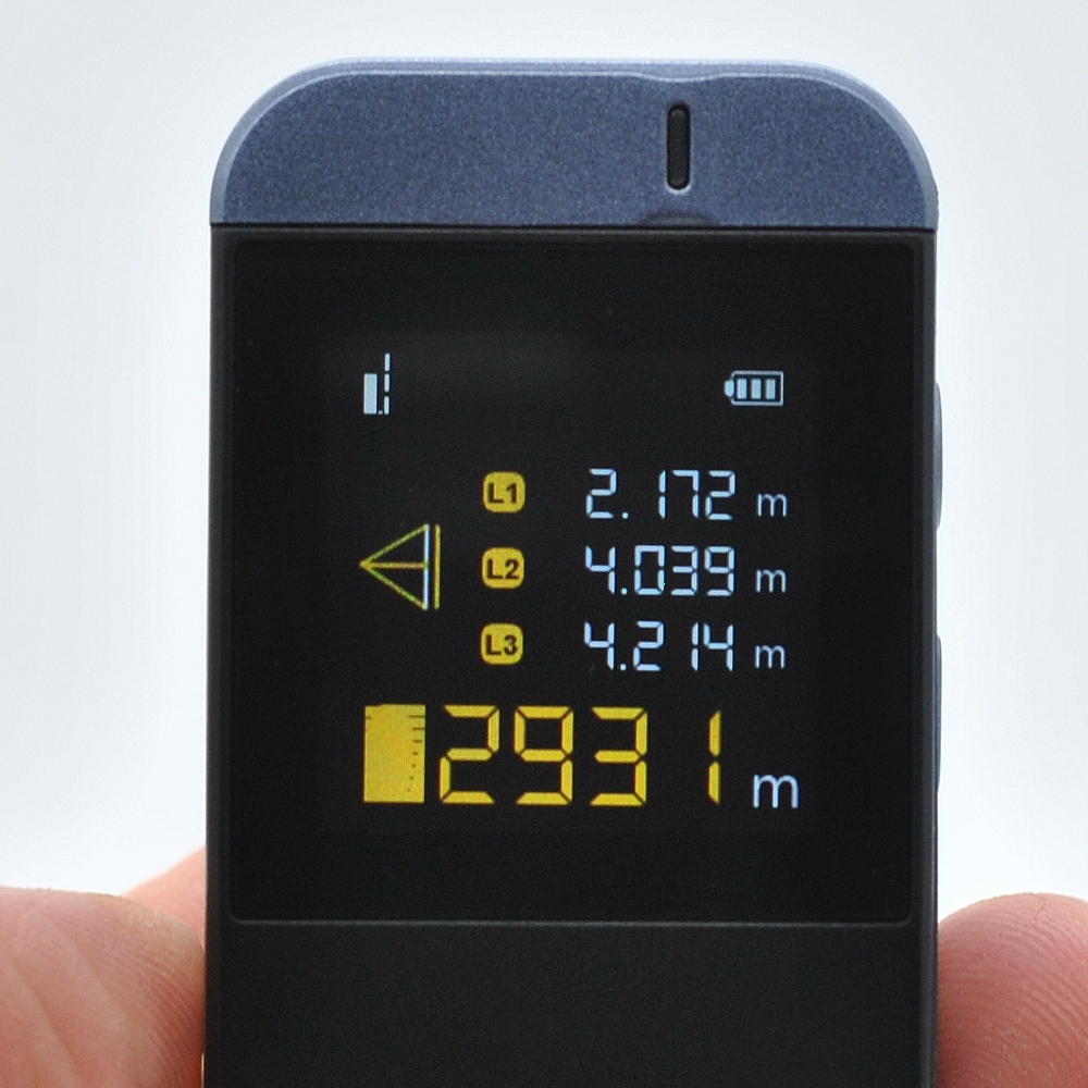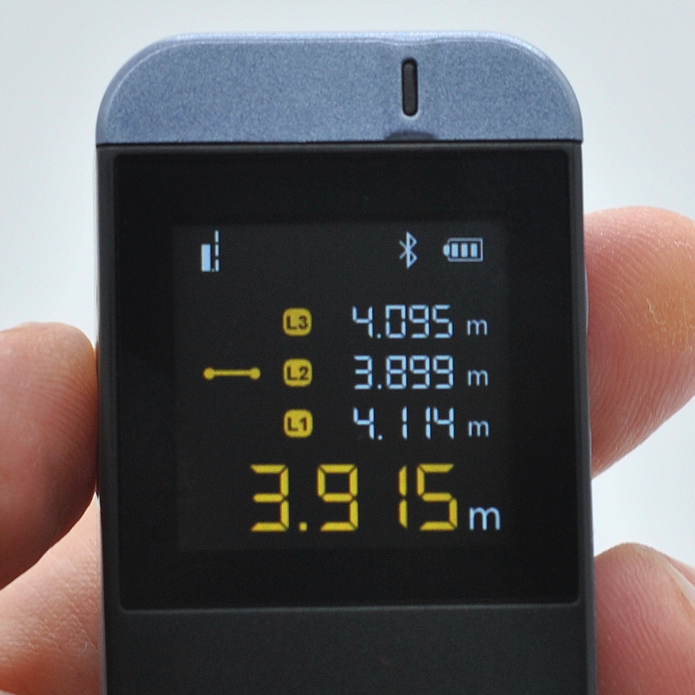 Экран в режиме линейных измерений (по умолчанию) отображает три прошлых измерения и текущее, место отсчета (задний торец или передний), индикатор Bluetooth и заряда аккумулятора. Уровня нет. Экран поворачивается по кругу на 90 градусов, по сигналу датчика положения. Причем делает это без тормозов, это порадовало, но можно и отключить эту возможность. Углы обзора и четкость изображения хорошие.