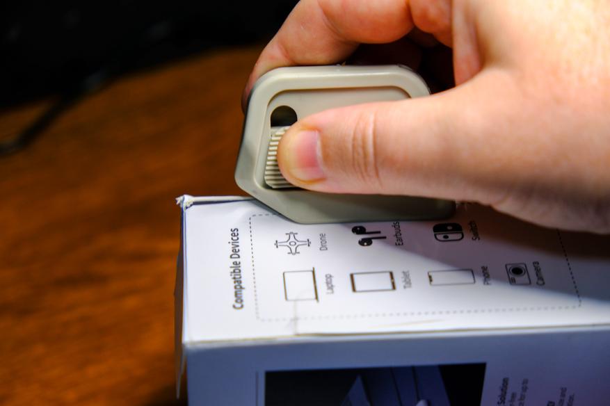 А мы теперь перейдём к тому, как это чудо работает. А работает оно реально хорошо. Вот для примера картонная коробка от зарядного устройства Ugreen (не реклама). Лёгким движением руки, ровно по краю вдоль угла, резак отделает верхнюю часть коробки от ее основания. Рез правда получается не идеально ровным, но нам ведь надо ехать, а не шашечки.