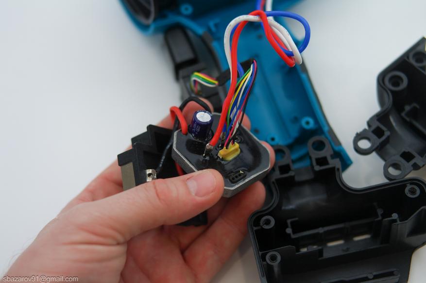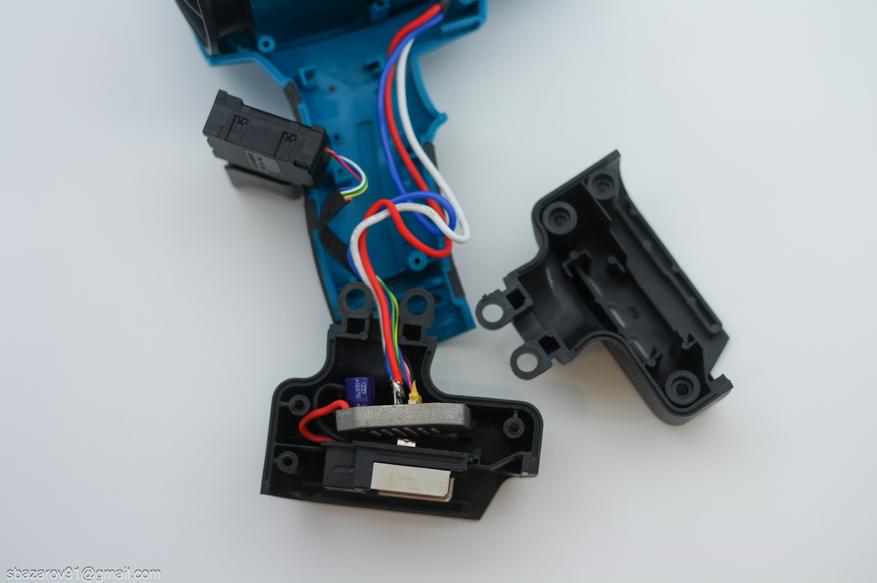 Конструкция башмака вызывает вопросы: его сделали съемным элементом, что кажется излишним. Внутри расположены контактная площадка для аккумулятора и плата управления, залитая компаундом. Для лучшего охлаждения плата помещена в металлическую ванночку, выполняющую роль радиатора. Ремонтопригодность низкая.