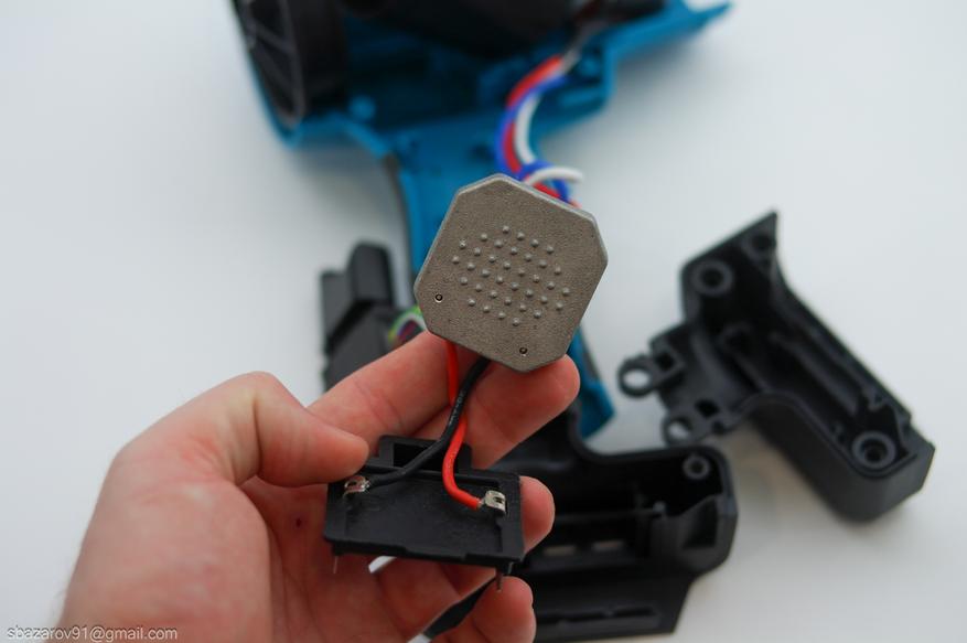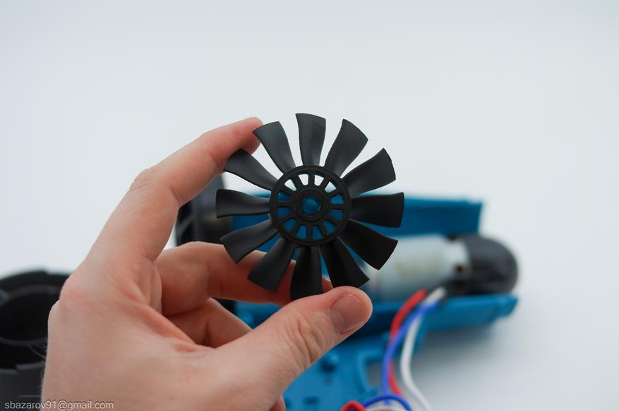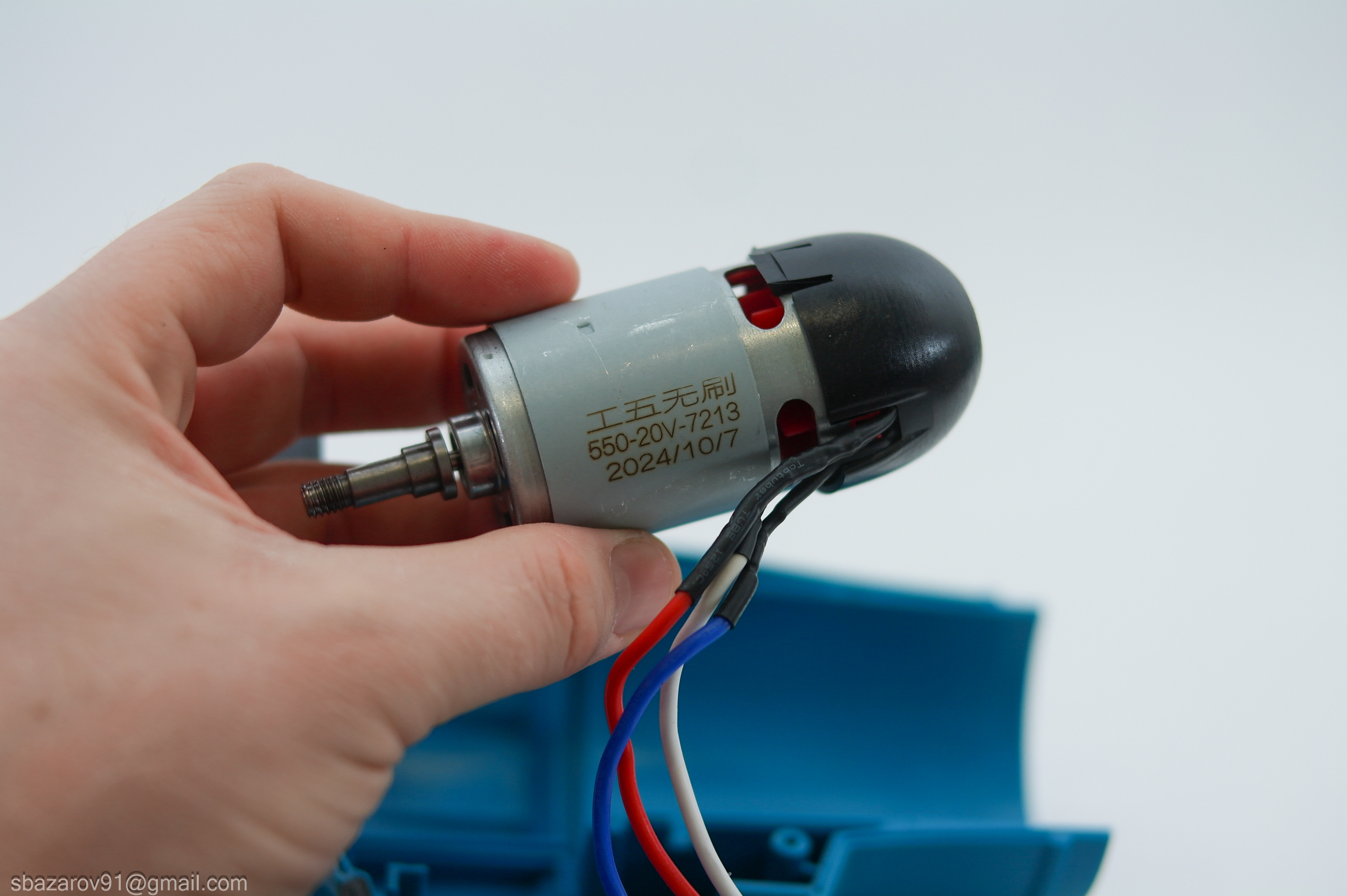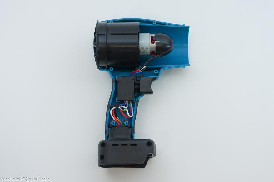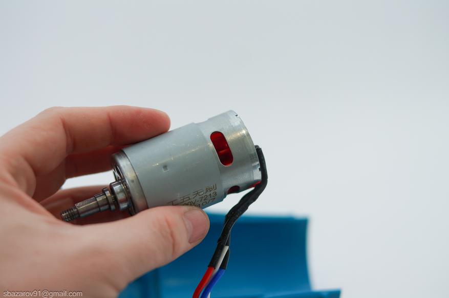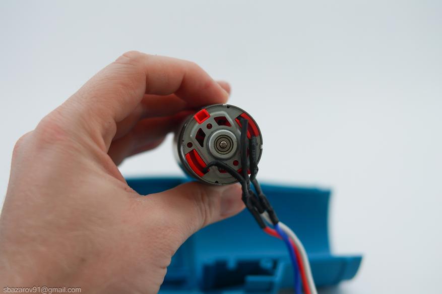 Сердцем фена является бесщеточный электродвигатель от компании Gongwu. Маркировка на двигателе — 550-20V-7213. Визуально он похож на коллекторный двигатель, но наличие трех проводов указывает на иную конструкцию. На валу двигателя установлена втулка, на которую крепится крыльчатка с 12 лопастями.