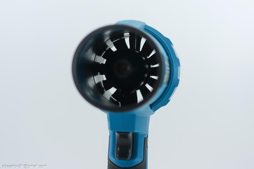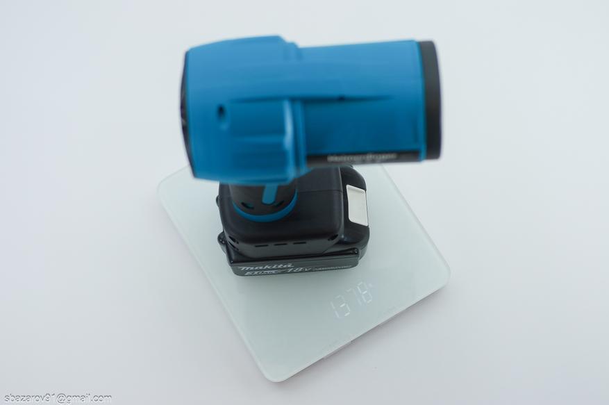 Для работы с аккумуляторным инструментом я использую оригинальные аккумуляторы Makita BL1830 со встроенной защитой. Точное энергопотребление фена неизвестно, поэтому я провел тест на максимальных оборотах, просто зафиксировав кнопку. Через 10 минут 30 секунд фен отключился, а на аккумуляторе осталось одно деление заряда. Предположительно сработала тепловая защита. На оставшемся заряде инструмент проработал еще 2 минуты на максимальной мощности. С одной стороны, 12 минут — это немного, но с другой — для фена, который сложно удерживать на максимальных оборотах, это вполне достаточно. Для повседневных задач, таких как продувка системного блока от пыли, хватает средних или низких оборотов.