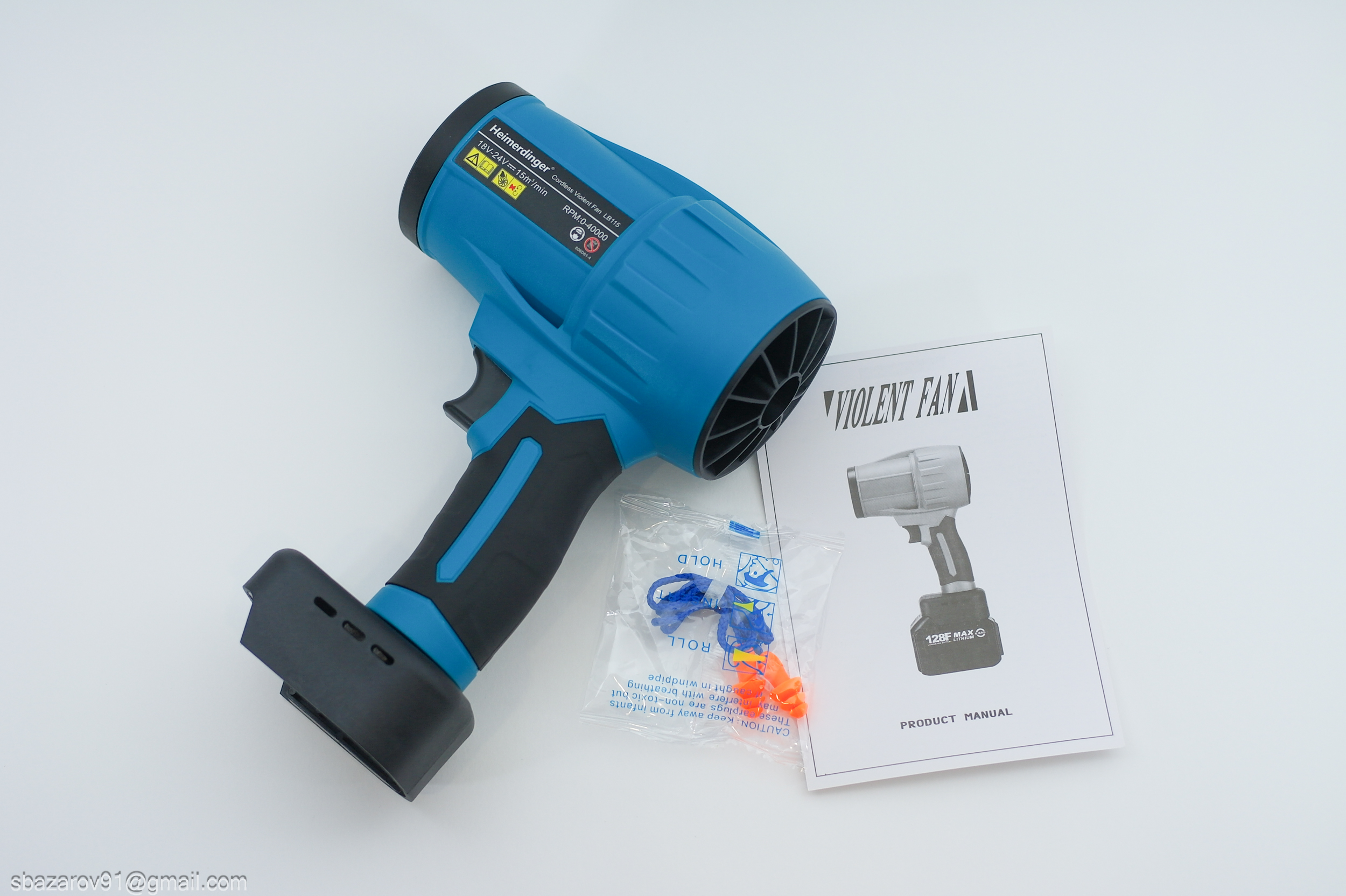 Внутри коробки находится сам фен (можно выбрать комплектацию с аккумулятором на 6 или 9 А*ч), беруши и руководство пользователя.