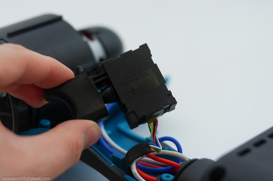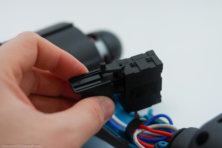 Пусковая кнопка стандартная, с возможностью переключения направления вращения. Поскольку в воздуходувке смена направления потока не требуется, переключатель спрятан внутри корпуса. Параметры кнопки — FA2-16 (42V/0.2A).