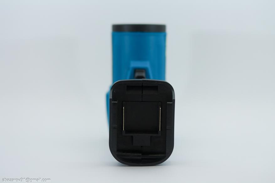 В нижней части фена находится платформа для установки аккумулятора. В отличие от привычного литого корпуса, где башмак для аккумулятора интегрирован в рукоятку, здесь он выполнен как отдельный элемент, который крепится внутри ручки. Байонет стандартный, подходят любые аккумуляторы Heimerdinger 18V или Makita LXT с аналогичным напряжением.