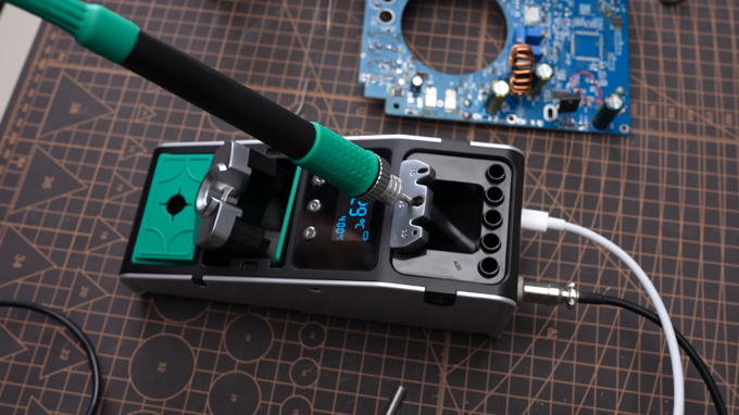 Первый диапазон температур пайки настраивается в пределах 150℃ — 450℃ с точностью регулировки в +-1 ℃. Также производитель заявляет что благодаря мощности в 60вт паяльная станция способна обеспечить скорость нагрева от комнатной температуры до 350 ℃ всего за 2 секунды. Настройка осуществляется с помощью кнопок на паяльнике, а параметры настройки выводятся на 1,3-дюймовый OLED-экран на самой станции.