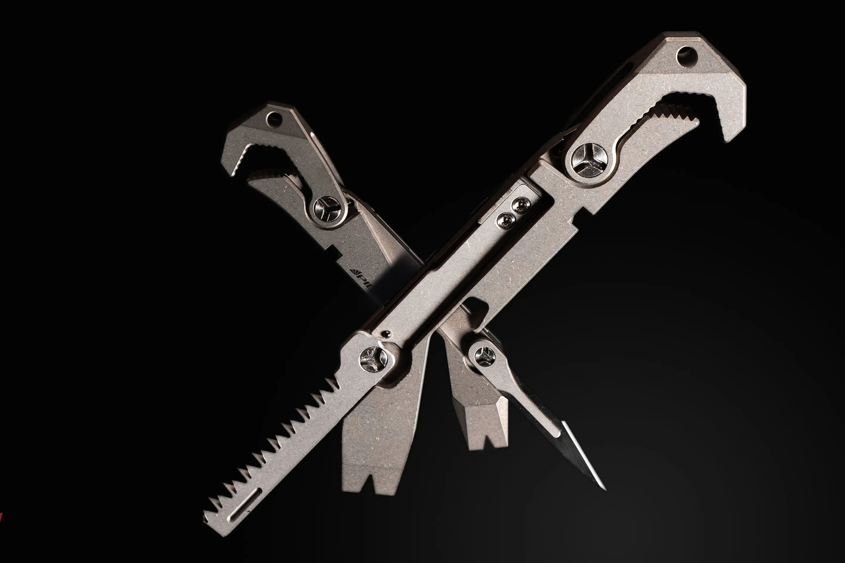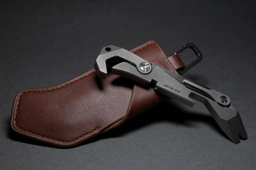 В данном компактном EDC-«малыше», выполненном из титана и весом всего 44 грамма, компания-производитель Pichi Design, смогла уместить следующие полезности: разводной (а вернее переставной) ключ с возможностью откручивать/закручивать гайки и болты с размерами от М2 до М12 (3/16 до 13/16 дюйма); сменное лезвие из нержавеющей стали; магнитный битодержатель для откручивания саморезов и винтов; открывашку для бутылок; маленькую монтировку-гвоздодер, а также складную пилу с мощным рельефным зубом. Пила и лезвие фиксируются с помощью замка liner. Плюс к этому инструмент идет в стильном кожаном чехле на ремень.