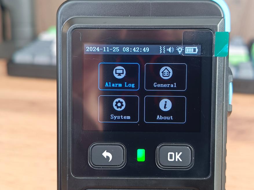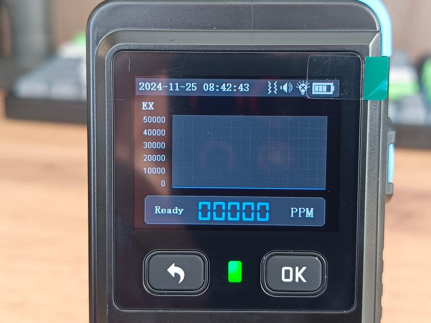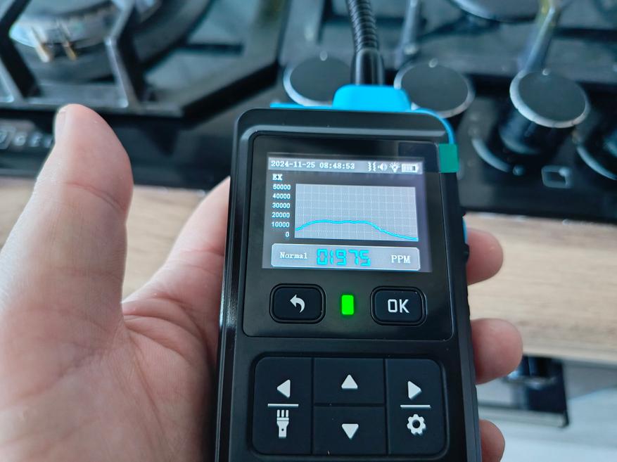Теперь о газе. Значения появляются на дисплее в течение примерно 5 секунд после того, как будет обнаружена утечка. Информацию можно вывести как в цифровом виде, так и в виде шкалы заполнения: она изменяется в зависимости от интенсивности утечки, переходя от светло-голубого цвета к ярко-красному. Также есть возможность отображать данные в виде графика, что позволяет наглядно отслеживать динамику изменения концентрации газа.