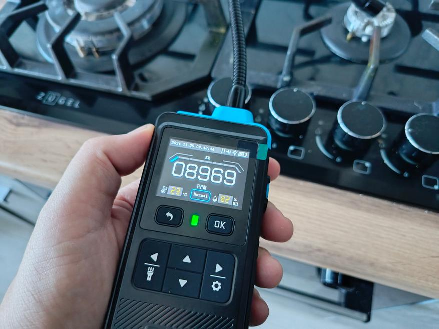 Помимо газа с варочной панели, прибор без проблем улавливает газ из зажигалки, которая работает практически на парах. Прибор реагирует на пары растворителей и бензина, а также на выхлопные газы автомобиля. В целом прибор показывает значения на дисплее, однако точно оценить их достоверность я не могу.