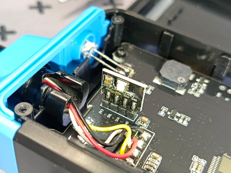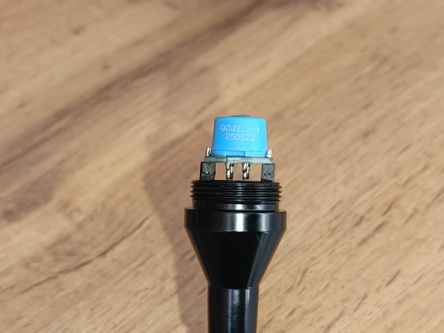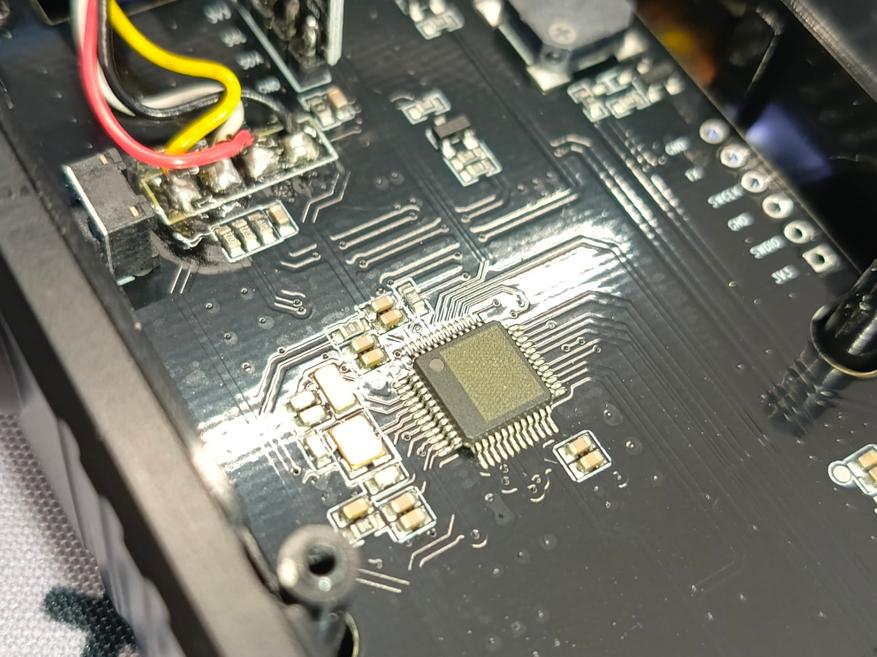 Датчик газа подключается четырёхпроводным жгутом и имеет маркировку QCJ2.5-1 250522. Внутри корпуса установлен модуль с датчиком температуры и влажности. Основная плата собрана на микроконтроллере без маркировки — её идентификация затруднена, так как надпись стерта лазерным гравером. Известно лишь, что контроллер имеет 48 выводов — по 12 с каждой стороны.