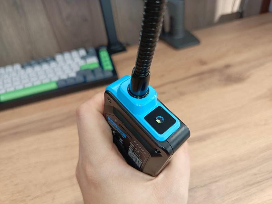 Датчик газа установлен на металлической штанге, из-за чего прибор весит почти 300 граммов. Длина штанги составляет 34 см, плюс около 13 см занимает корпус устройства. Сверху находится встроенный фонарик, включение которого вынесено на отдельную кнопку. Яркость фонарика не впечатляет, но для подсветки тёмного участка его возможностей вполне достаточно.
