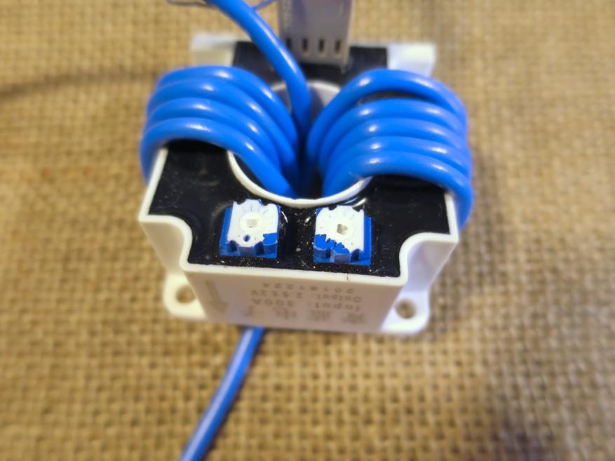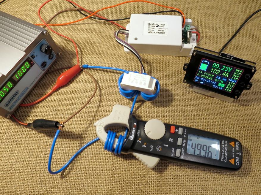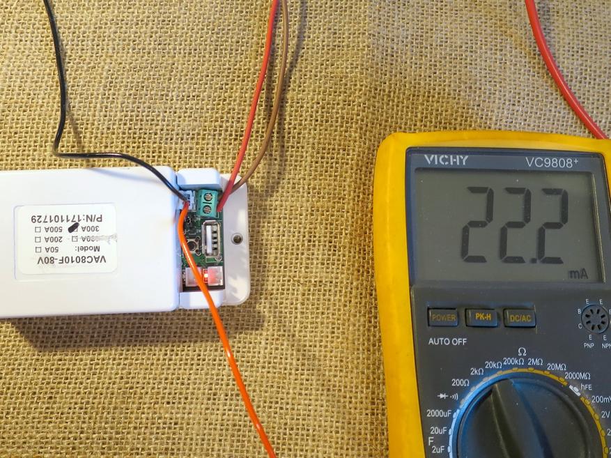 Чтобы проверить токи в наиболее интересных диапазонах, я намотал провод на датчик несколько раз. Один сквозной проход и 9 витков эквивалентны повышению измеряемого тока в 10 раз относительно номинала. Точно так же я поступил с клещами, только там 5 витков. Можно заметить, что имеются расхождения в показаниях, приблизительно 2,4%.
