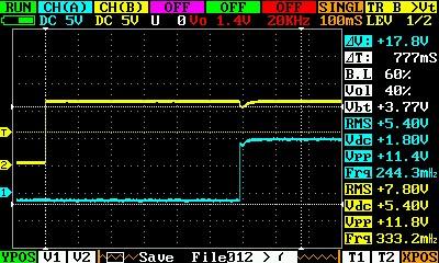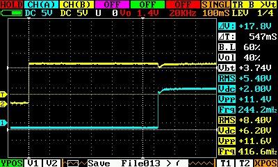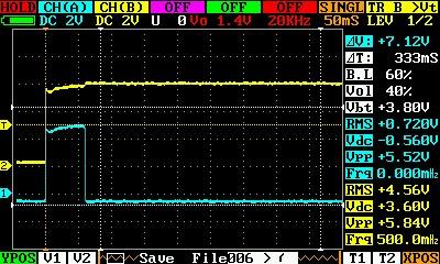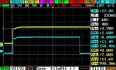 Скорость срабатывания реле я тоже посмотрел. С этим проще. Настроил порог отключения зарядки по току в 1 ампер. А потом пустил через датчик Ток почти в 2А. Напряжение на нагрузке и напряжение на реле отключения вывел на экран осциллографа по двум каналам.