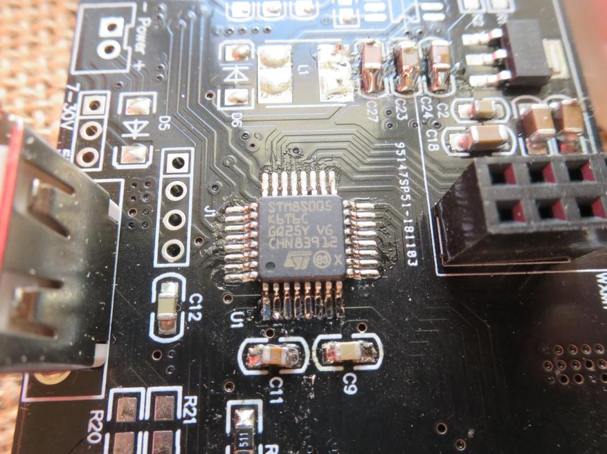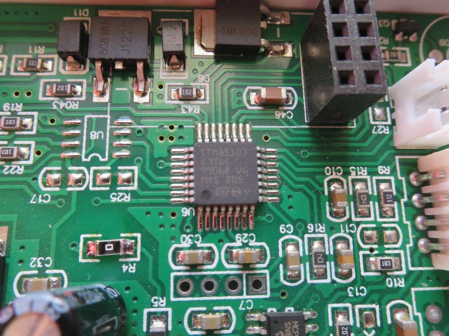 Блок управления собран на контроллере STM8S005K6. Пайка среднего качества, флюс не смыт.