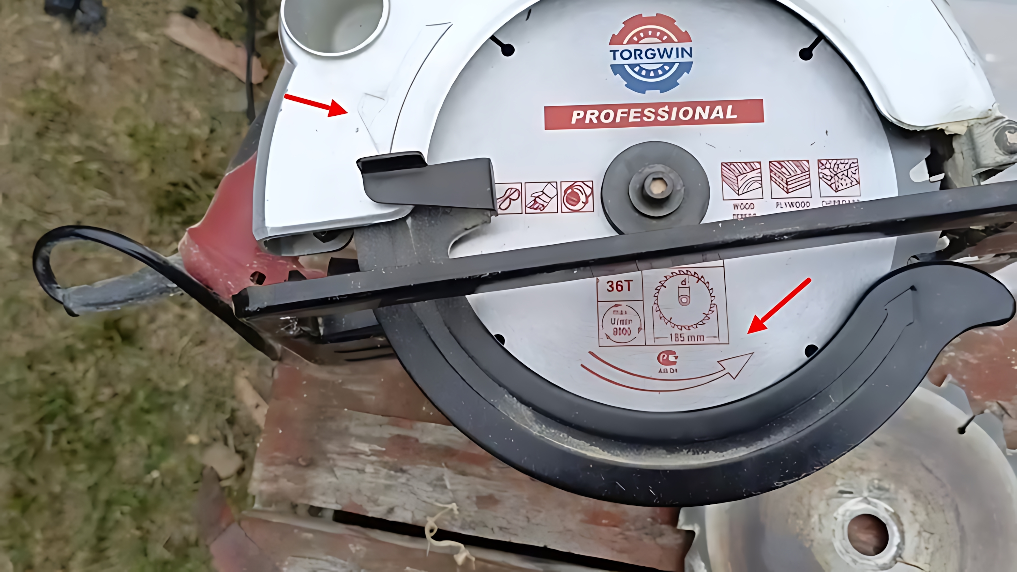 Смотрим на инструмент. На любом, абсолютно любом инструменте (пила, болгарка) есть маркировка — стрелка, показывающая направление вращения вала. На дисковой пиле она обычно выбита прямо на защитном кожухе.