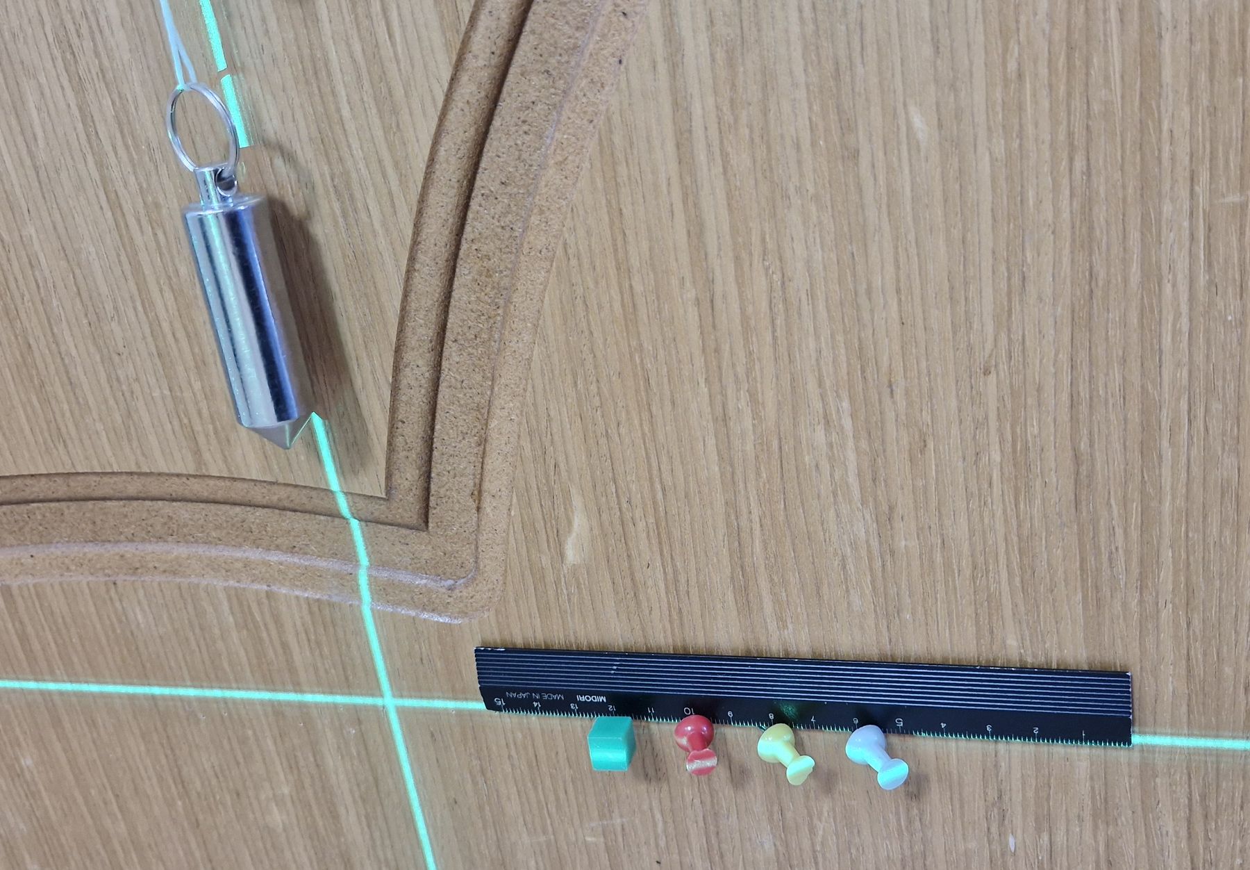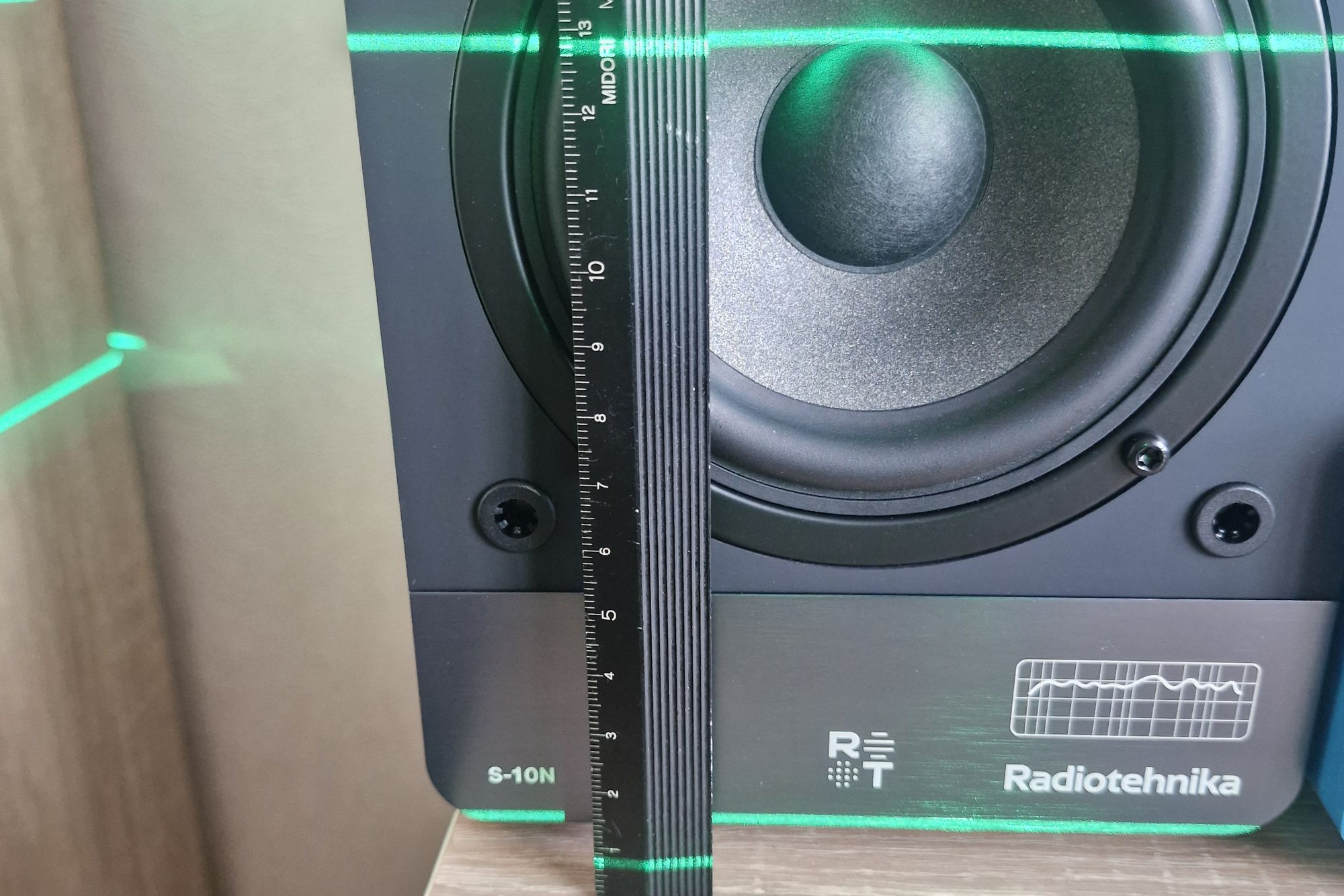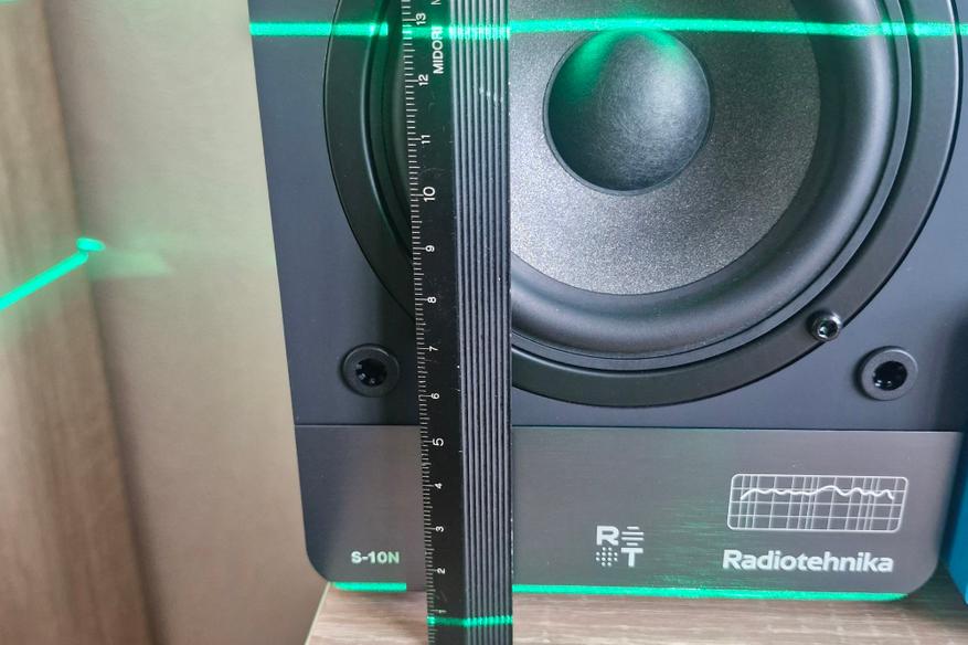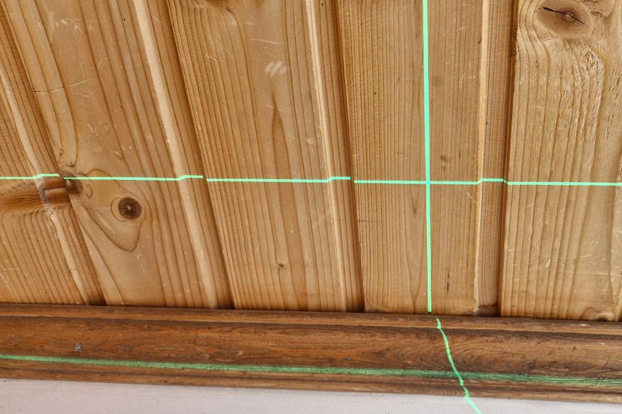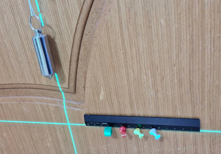 Высота первой горизонтали 7 мм, второй почти 13 см. Вертикальные линии дают перекрестие на потолке — удобно для разметки.