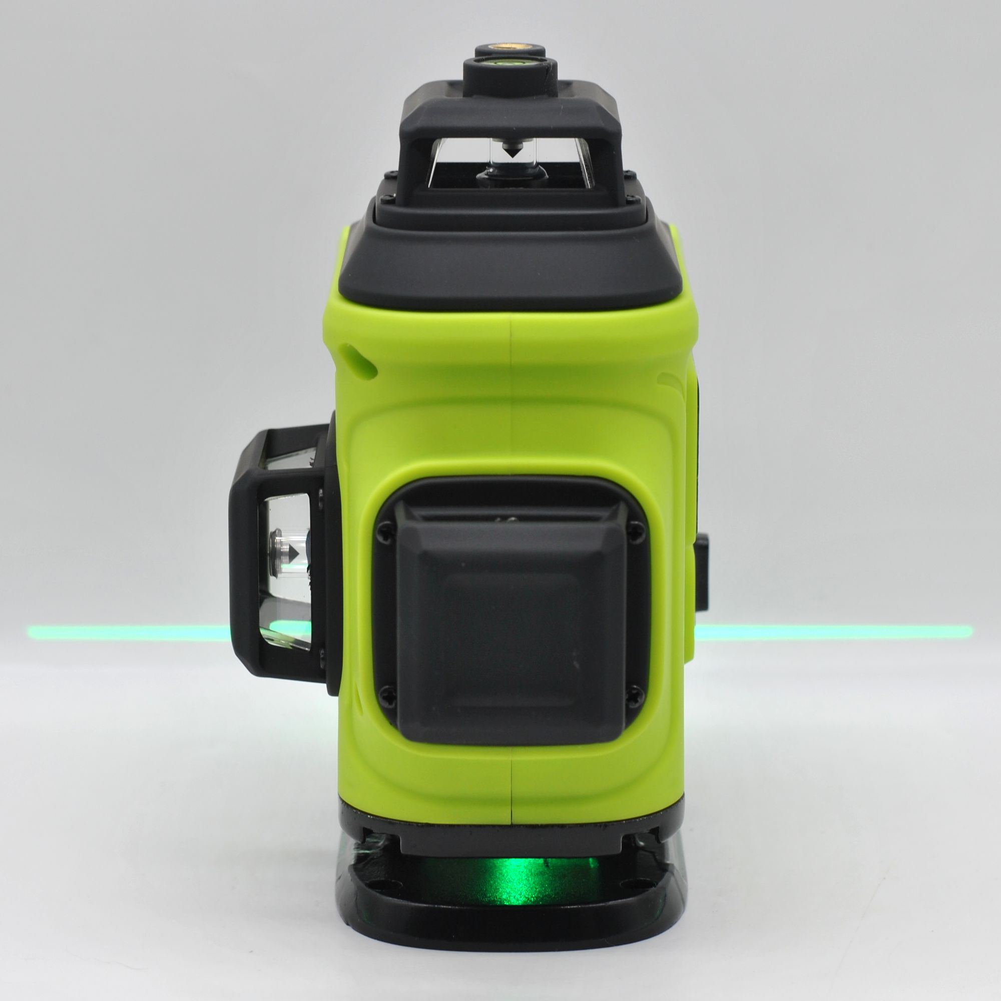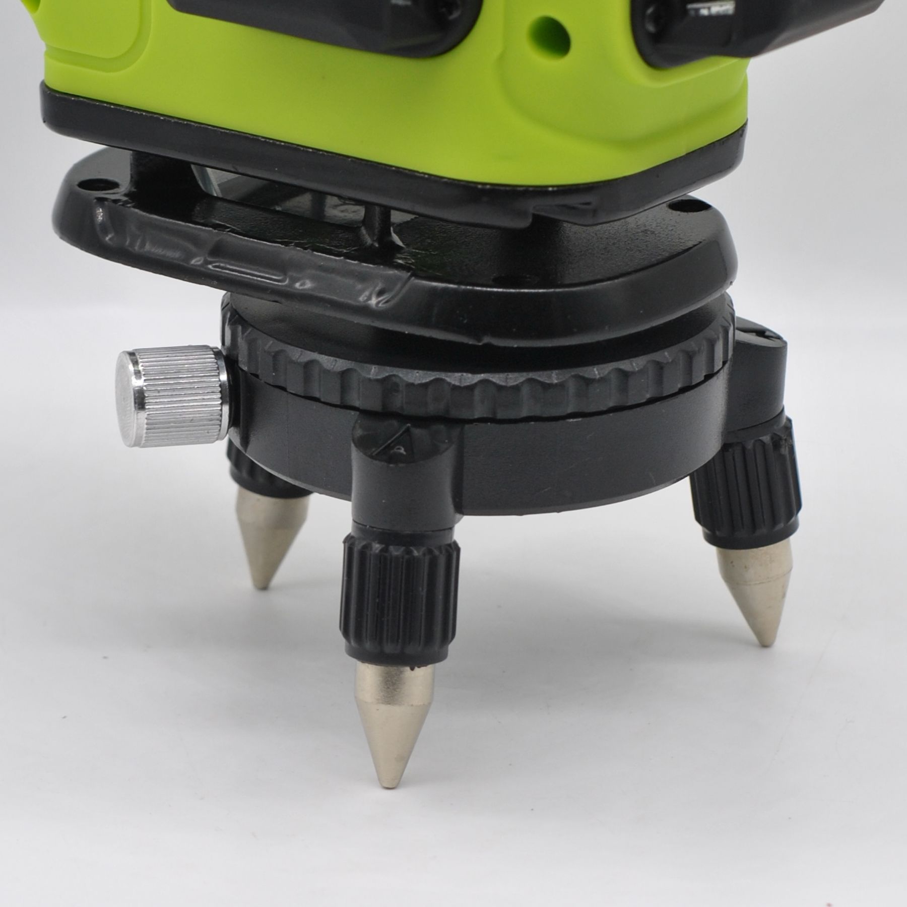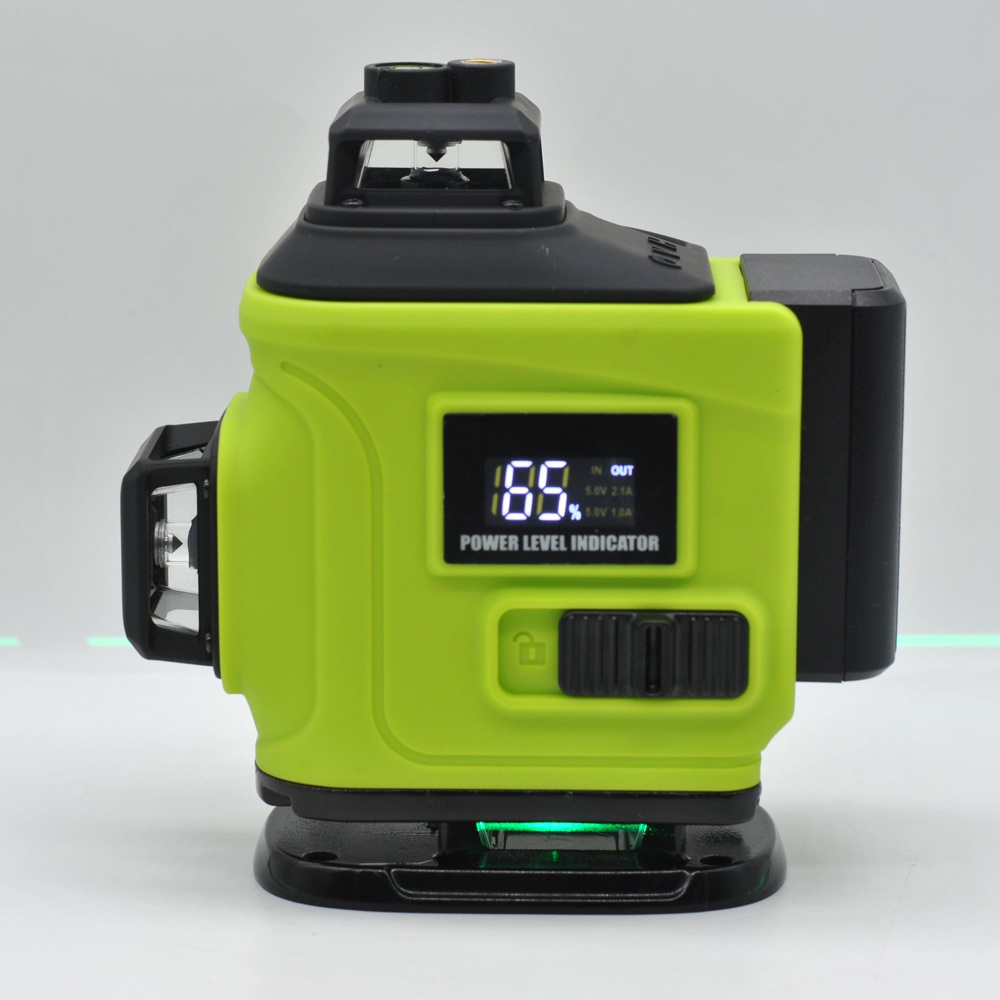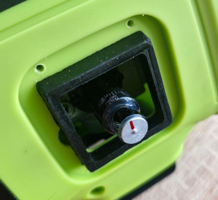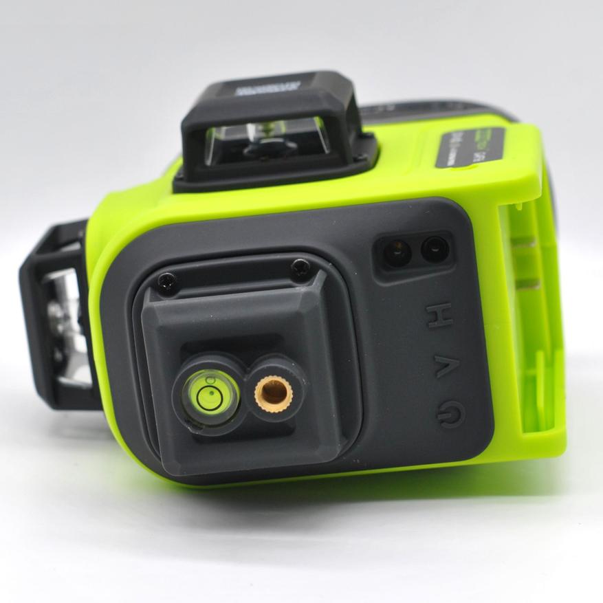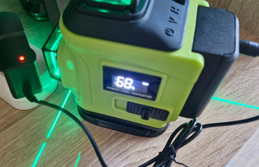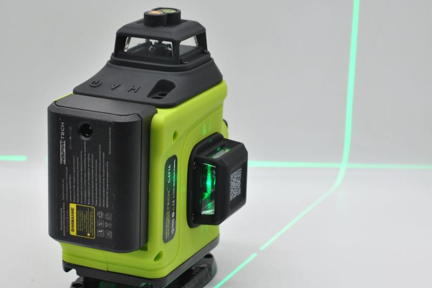 Корпус выполнен из софт-тач пластика, опорная площадка из алюминия, причем плоскость отфрезерована. Для развертки четырех плоскостей тут 4 излучателя зеленого лазера. Не пожалели пузырьковый уровень на корпус и дисплей индикатор уровня заряда.