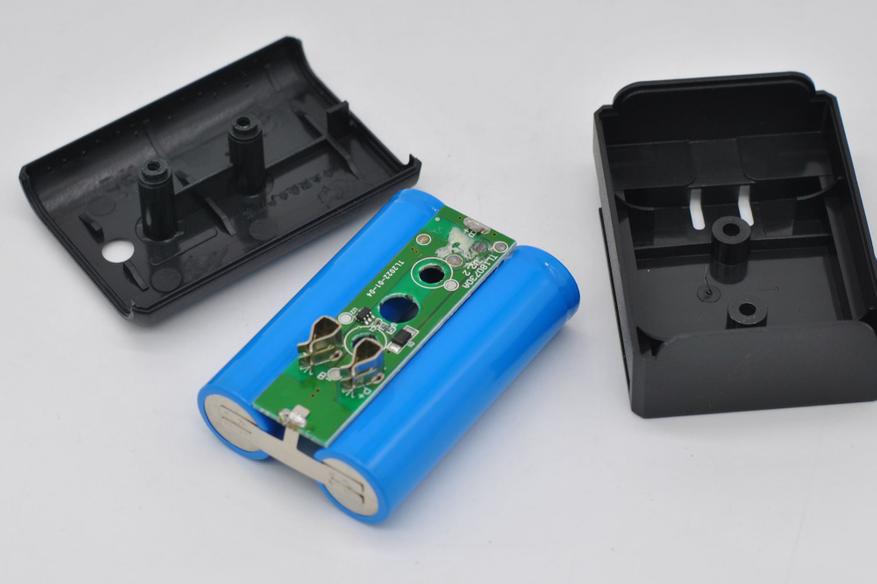 Аккумулятора в комплекте два, это позволит не прерываться на зарядку, также доступна и работа во время зарядки. Размеры 7х5х2,5 см, масса 109 г, внутри пара элементов формата 18650 непонятной принадлежности.