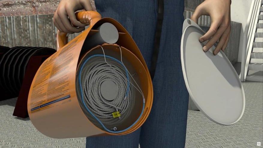 Устройство имеет каплевидную форму с двумя цилиндрическими отсеками. В большом отсеке размещается катушка с намотанным канатом, в верхнем узком цилиндре находится пусковая труба для ракеты. Конструкция рассчитана на управление одним оператором.
