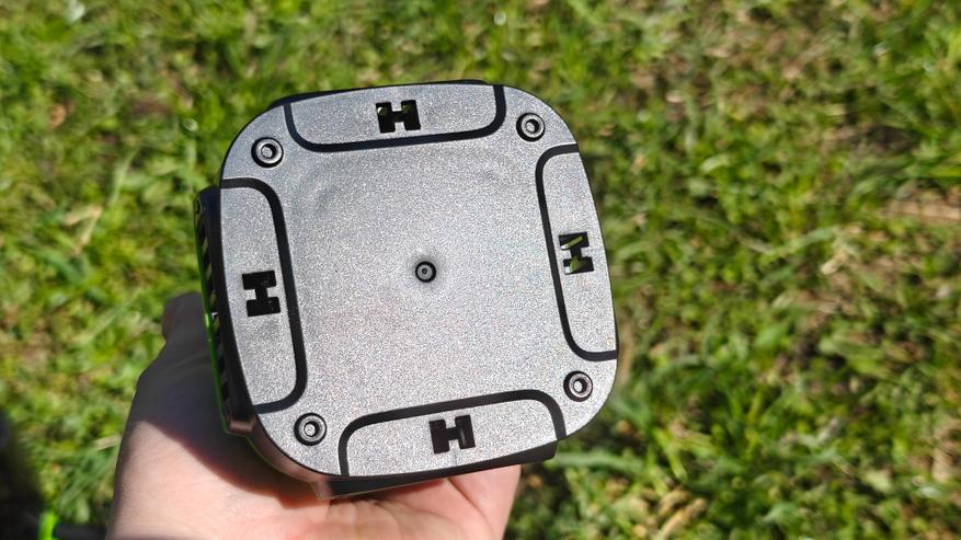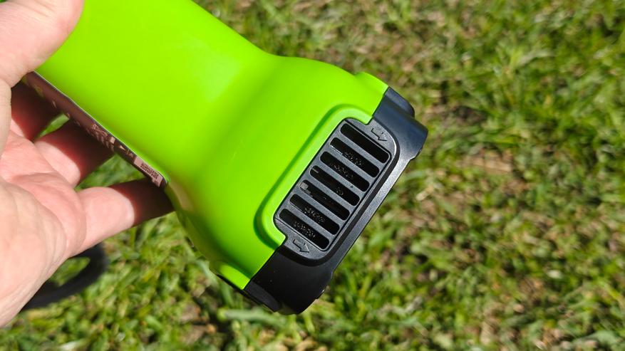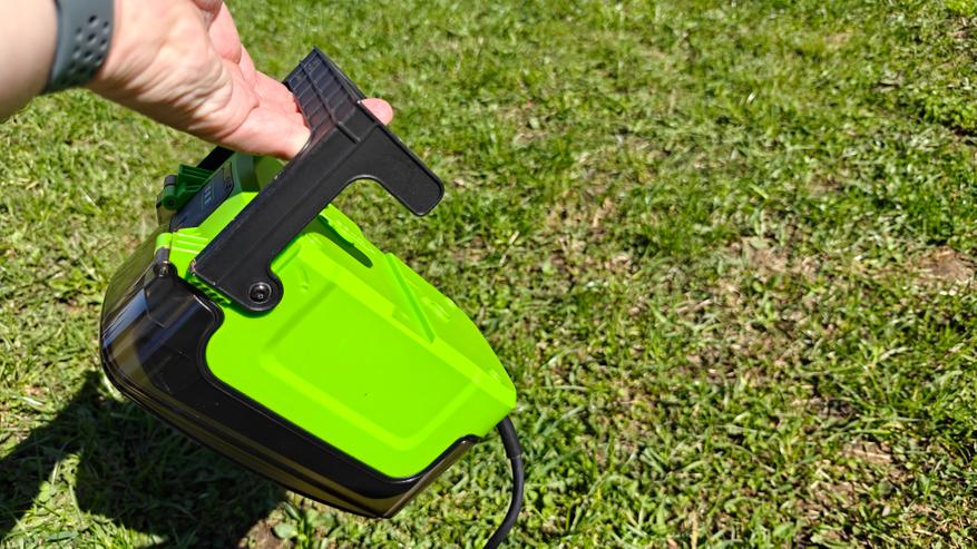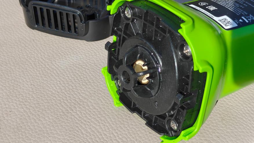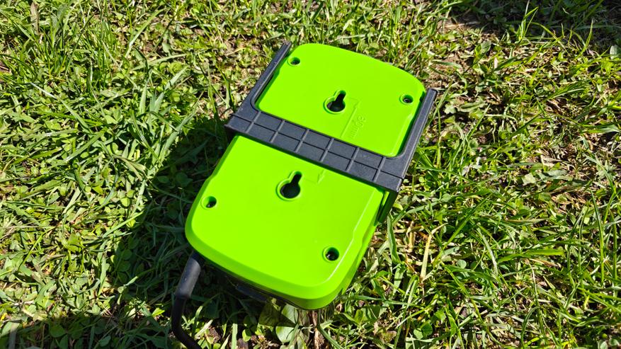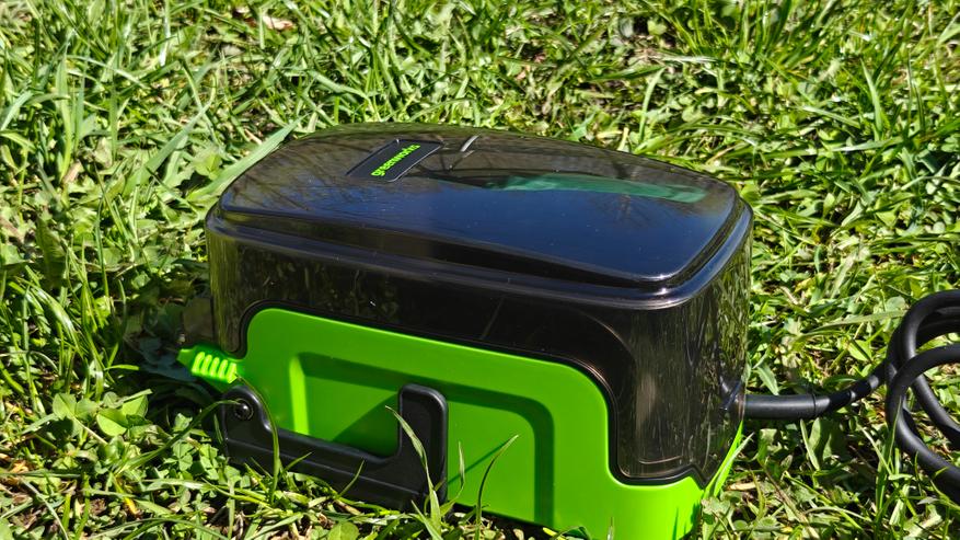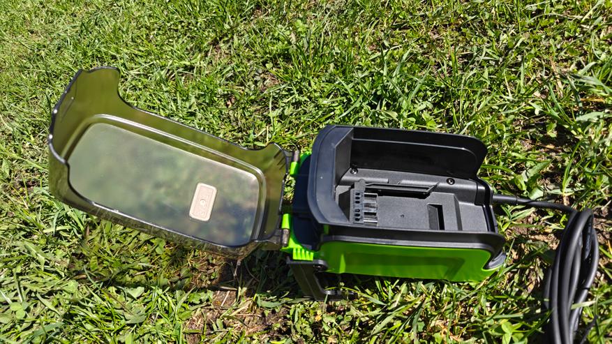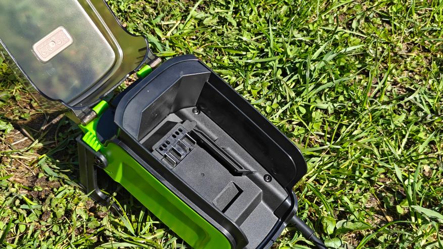 Вторая часть это отсек для установки типового аккумулятора на 24В от компании Greenworks. Тут стоит отметить, что батарейный отсек защищен от попадания воды по стандарту защиты IPX4. То есть он не боится росы, дождя и капель воды при поливе. Сверху открывается полупрозрачная крышка, внутри классическая платформа 24В Greenworks. Oтсек спокойно вмещает аккумулятор на 4А. Думаю, спокойно влезет и более емкий аккумулятор.