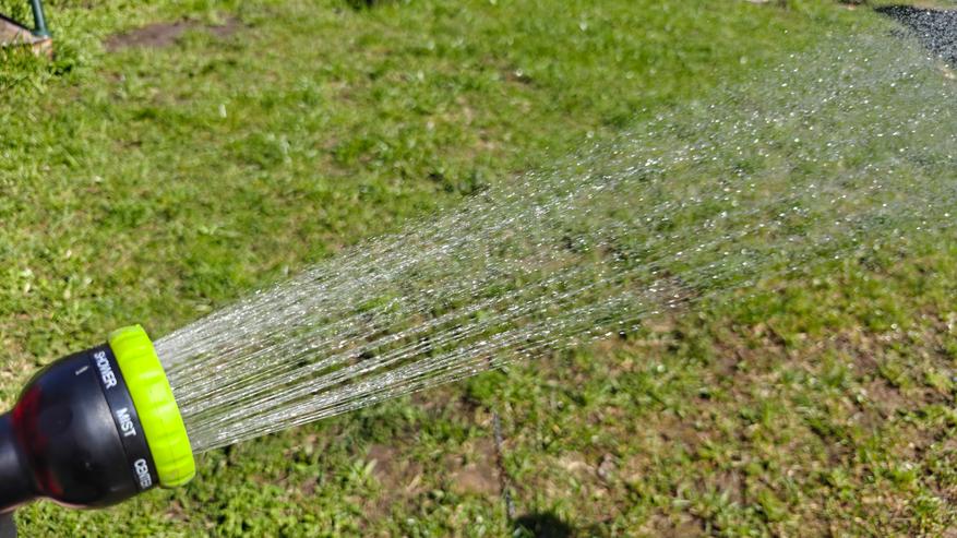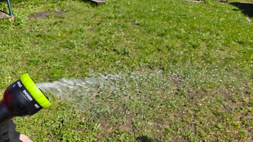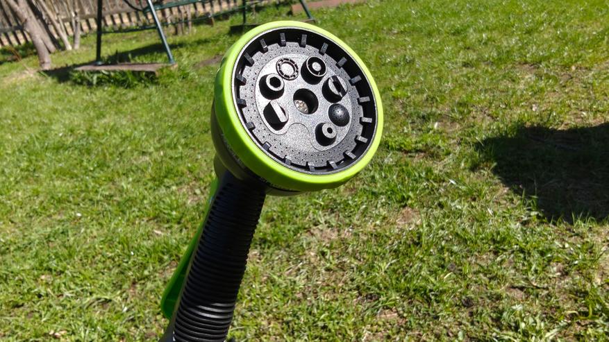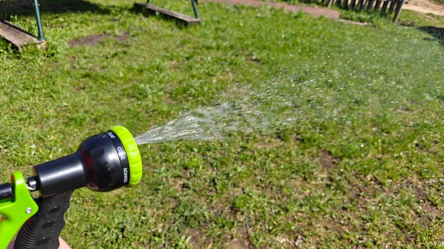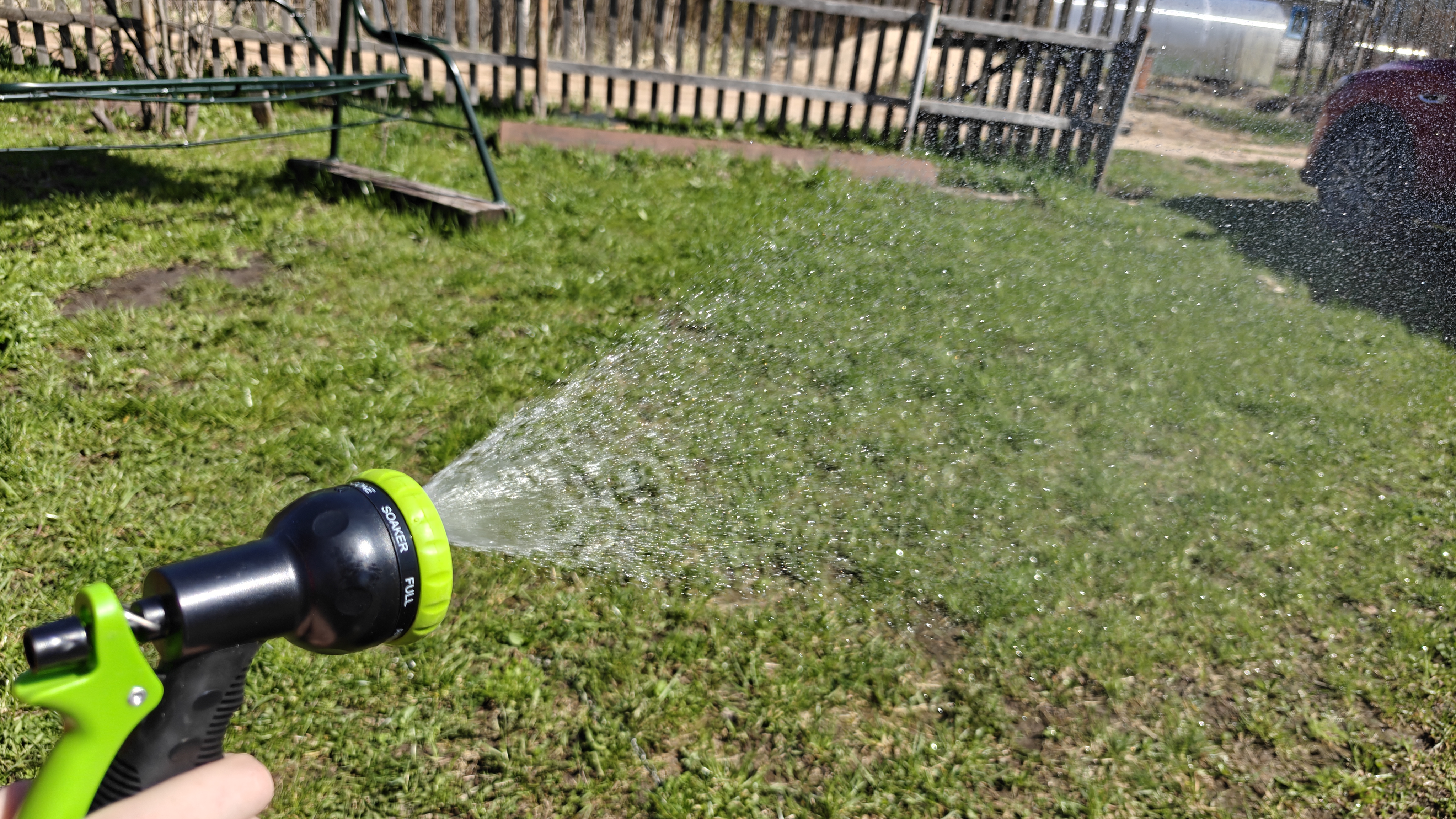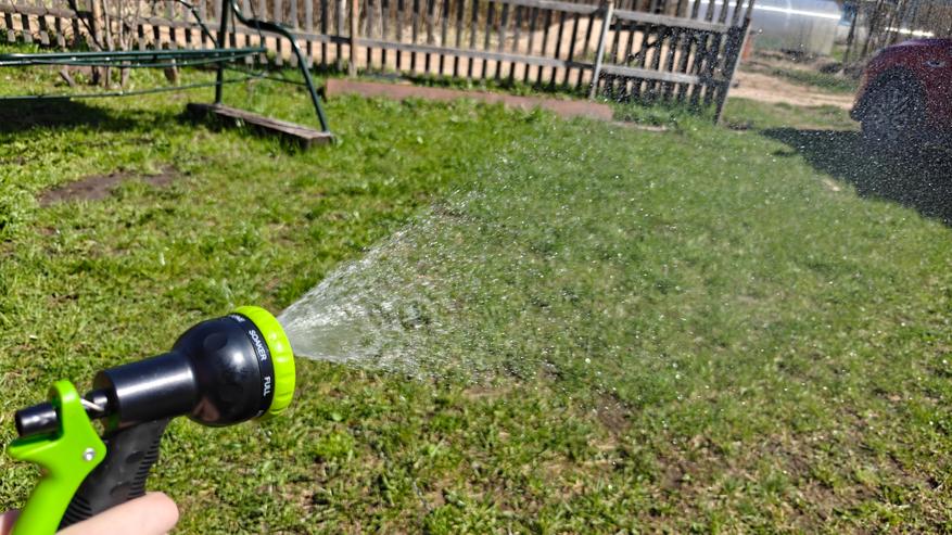 Лейка имеет классические режимы для полива. Тут и мощная струя, и легкий душ, и подача воды без напора с рассекателем. В общем можно подобрать режим для полива абсолютно любой культуры. У пистолета есть фиксатор нажатия, чтобы не жать постоянно на рукоятку, а зафиксировать и поливать расслабленно. А главное, насос практически бесшумен.