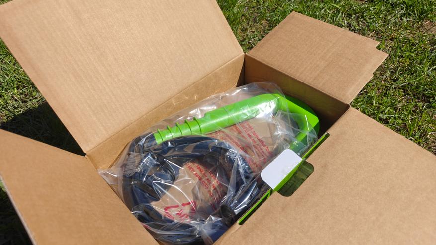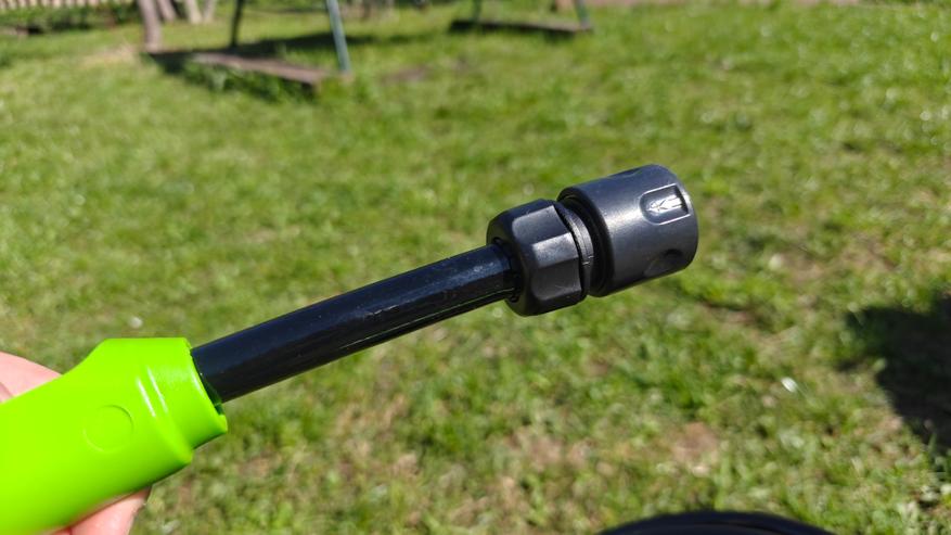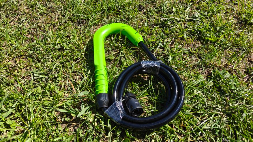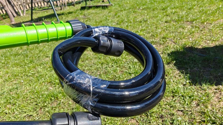 В комплекте с насосом поставляется гибкий шланг для полива с быстросъемными соединителями формата 3/4″. Зеленый пластиковый фиксатор требуется, чтобы шланг не перегибался через край бочки и при помощи его легко разместить насос на требуемую глубину. Шланга хватает на глубину ёмкости до 2 метров. Быстросъёмные соединители облегчают задачу подсоединения поливочного шланга (в комплект не входит).
