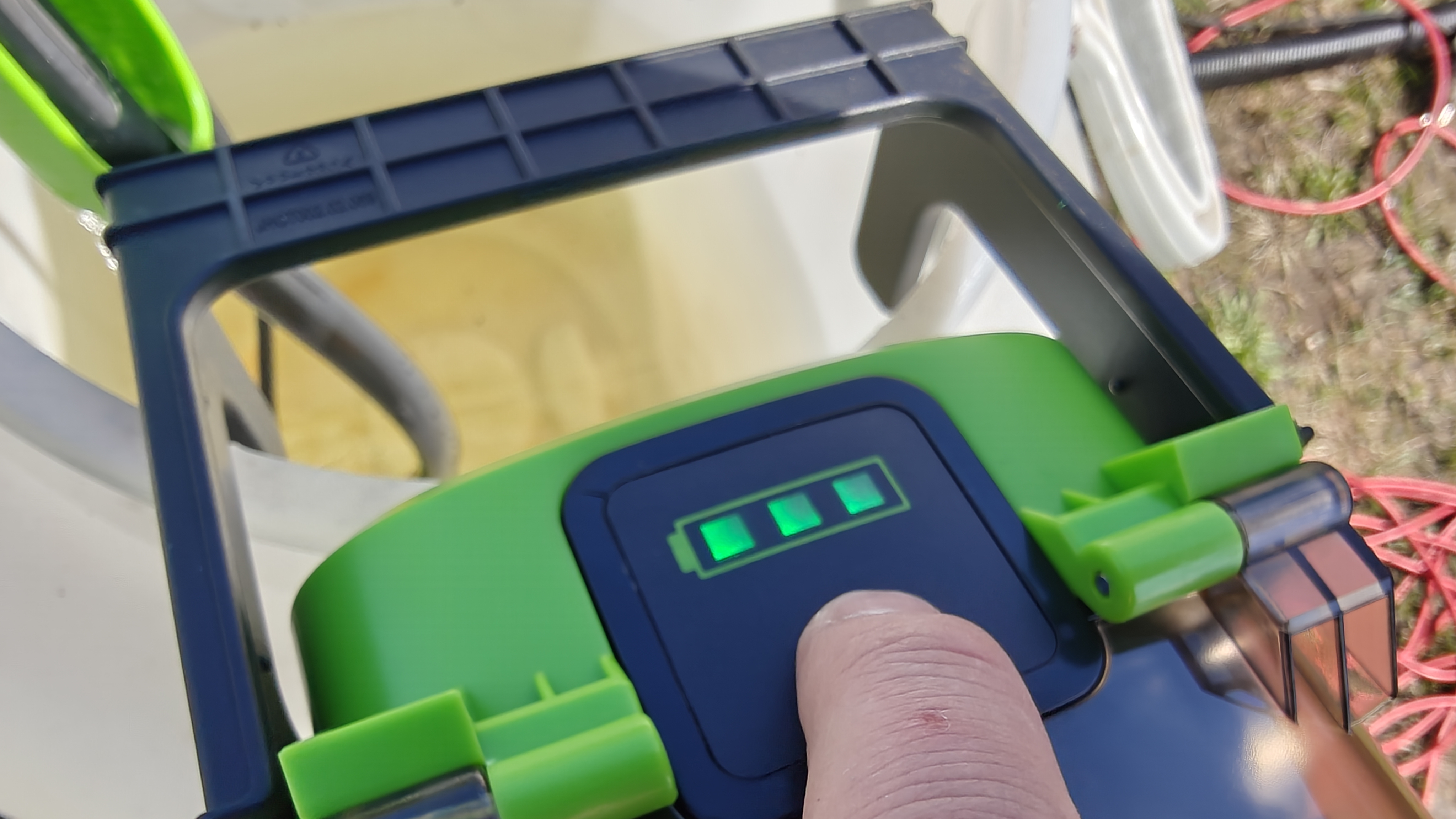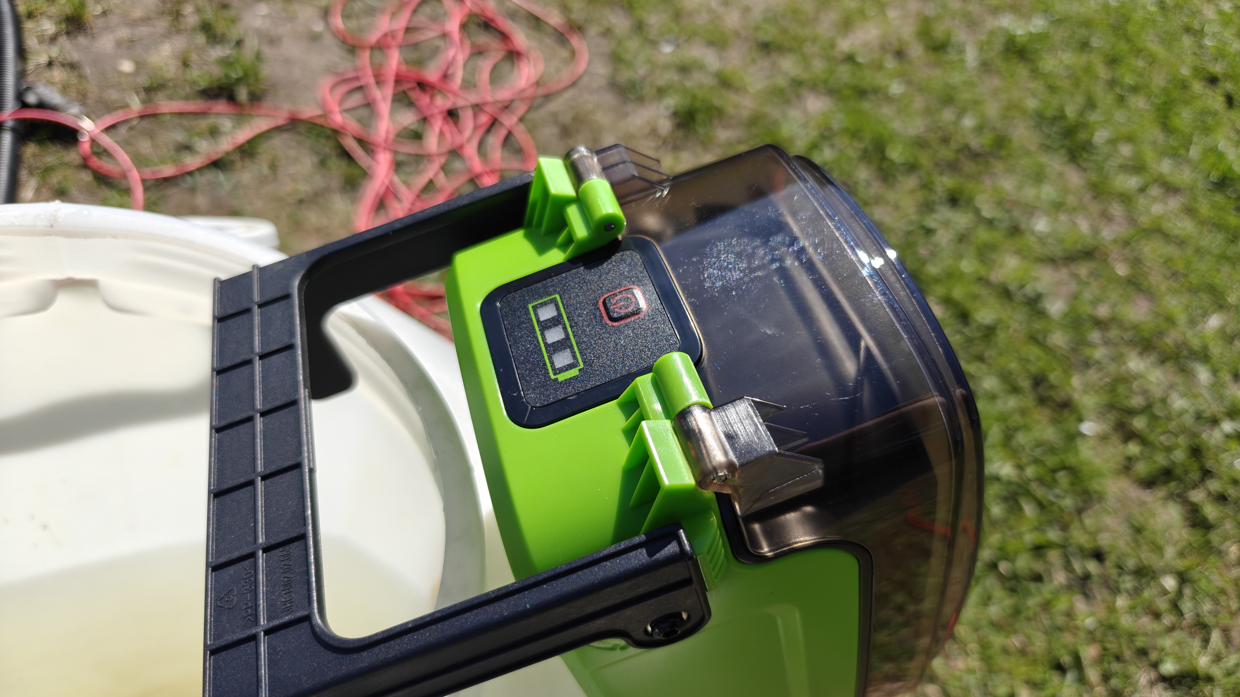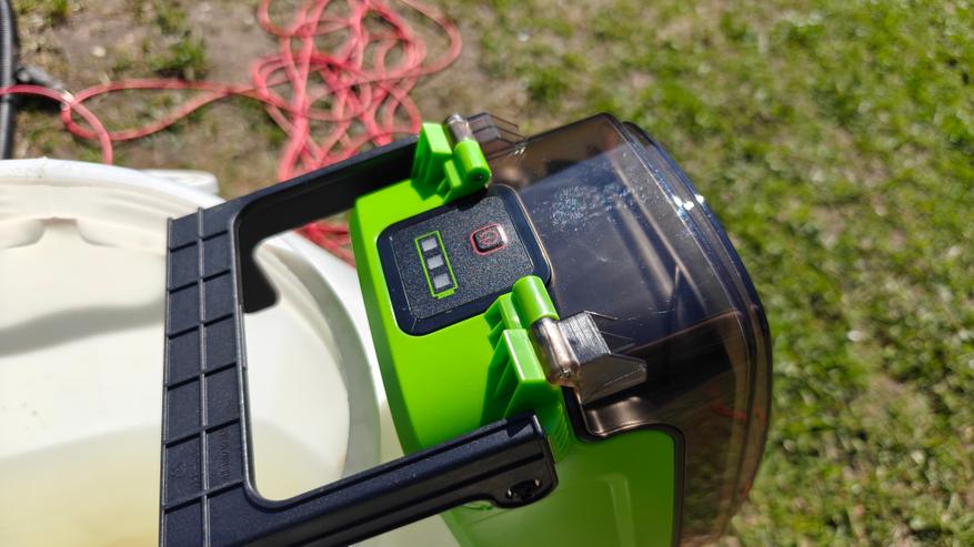 На верхнем торце аккумуляторного блока размещена кнопка запуска насоса и светодиодная индикация уровня заряда батареи. Это удобно, чтобы не открывать крышку, а сразу знать, каков заряд.