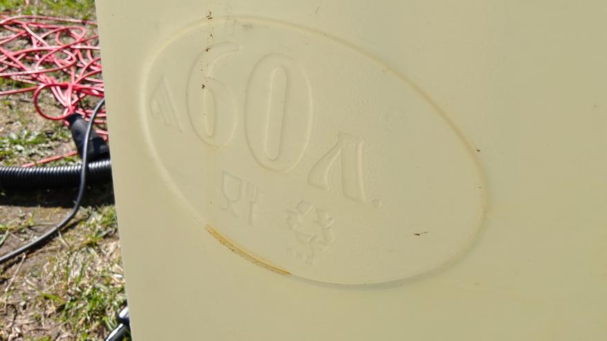 Для эксперимента берем бочку объемом 60л, просто потому что другой не оказалось под рукой. Наливаем воду, размещаем аккумулятор в отсеке. Рядом располагаем заборный шланг на пластиковой раме.
