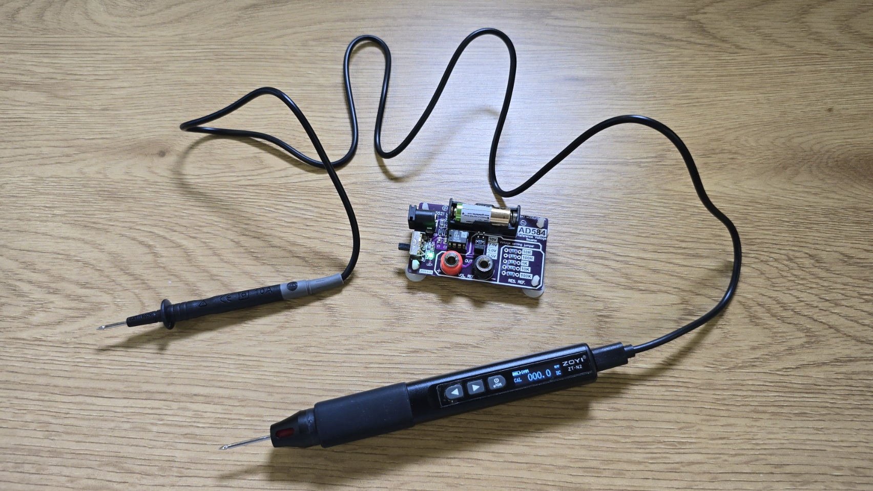 Для дальнейшего тестирования точности мультиметра ZT-N2 я использовал модуль высокоточной эталонной шкалы напряжений AD584, который предоставляет четыре канала с фиксированными значениями напряжений: 2.5В, 5В, 7.5В и 10В. Кроме того, модуль включает пять уровней сопротивления для калибровки: 100 Ом, 1 кОм, 10 кОм, 100 кОм и 1 МОм.