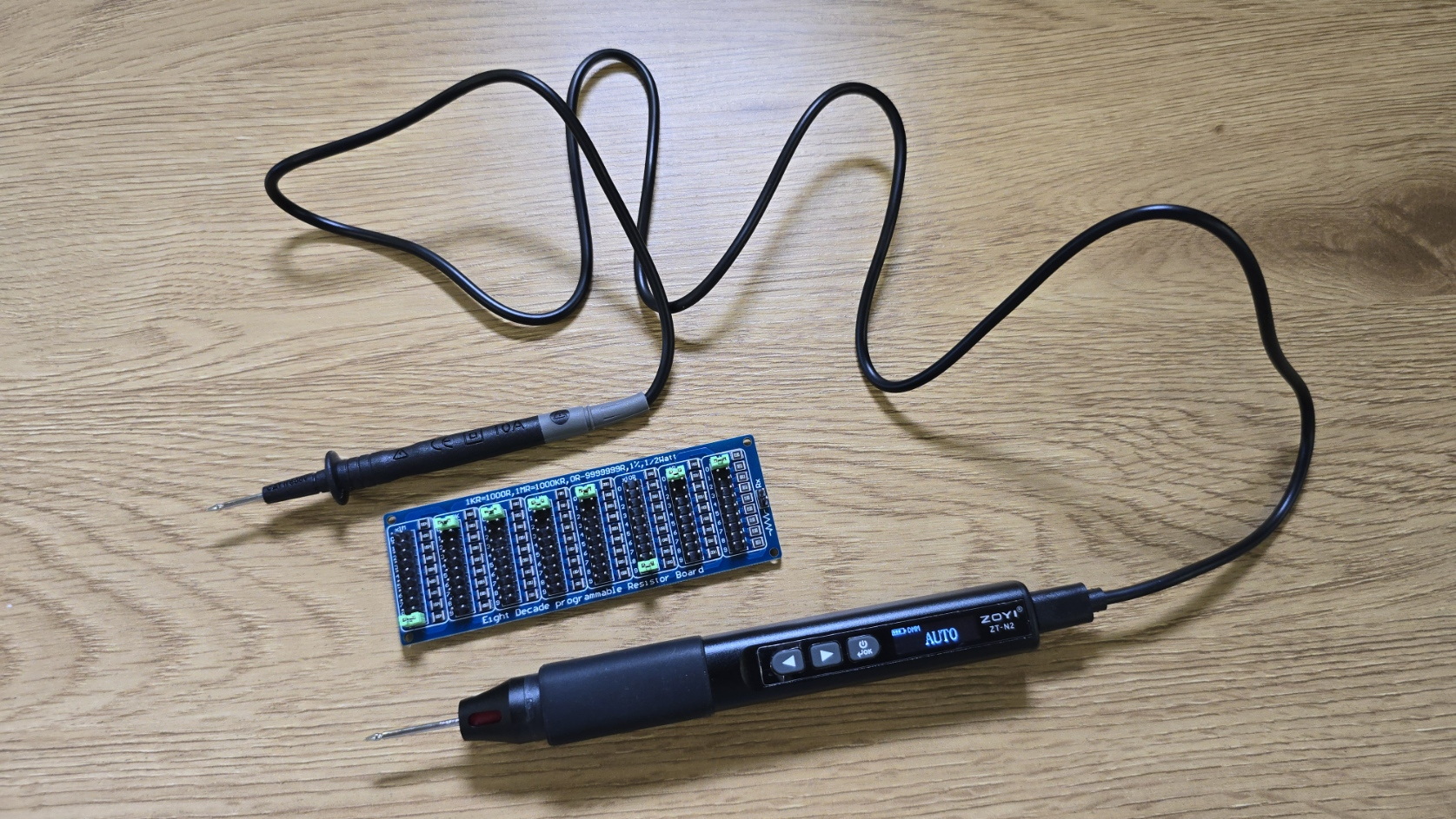 В ходе тестирования мультиметра я также использовал высокоточный модуль программируемого резистора с диапазоном сопротивлений от 0.1 Ом до 9 999 999 Ом (0.1R-9999999R Programmable Resistor Resistance Board Module High Precision 1/2W 1% 8-Segment Jumper Caps). Этот модуль позволяет переключать различные значения сопротивления с высокой точностью, что делает его отличным инструментом для проверки точности измерений мультиметра. Для начала я подключил щупы мультиметра к модулю, выбрав начальное сопротивление в 0.1 Ом. Мультиметр ZT-N2 без труда распознал это значение, отобразив его на OLED-дисплее. Далее я последовательно увеличивал сопротивление, переключая сегменты на программируемом резисторе, проверяя точность при разных значениях. В каждом из этих диапазонов мультиметр показывал в меру точные результаты, соответствующие заявленной точности +-(0.5%+4).