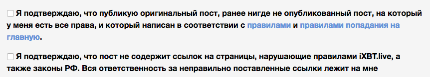 Первая галочка сразу выводит пост на главную, вторая делает ссылки без редиректа, для того чтобы избежать потерь трафика на аффилиатных ссылках. Автор соглашается с тем, что при выводе на главную лайва, его пост может быть опубликован на главной iXBT.com. На главной iXBT.com мы публикуем посты, написанные хорошим русским языком, c качественными фотографиями и правильными тестами, например такие.