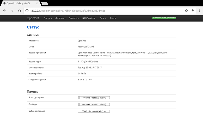 Важная часть операционной системы — система OpenWrt версии 15.05.1. Эта открытая и расширяемая система изначально предназначена для маршрутизаторов, предоставляя очень широкие сетевые возможности. В боксе она служит основой для большого числа сетевых сервисов, среди которых: Samba сервер, FTP сервер, торрент-клиент Transmission и пр. OpenWrt работает параллельно с Android. Т.е. ядро Linux одно, а уровнем выше уже работают Android и OpenWrt. Для гиков возможности OpenWrt вообще безграничны. Часть сервисов из OpenWrt можно включить в обычных Настройках:
