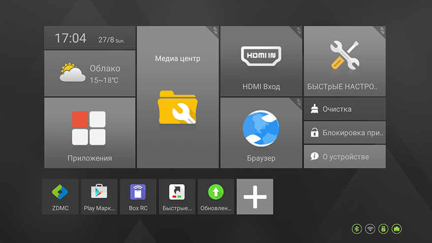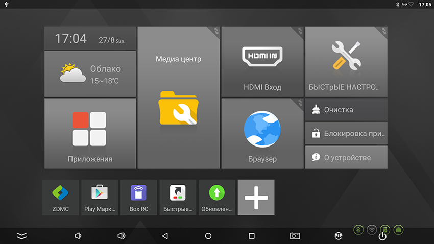 В качестве лаунчера (домашнего экрана) выступает ZIUI. Под названием ZIUI скрывается не только лаунчер, но и набор программ, разработанных Zidoo, и часть интерфейса. Лаунчер имеет приятный интерфейс и кастомизацию. Если вам он не нравится, то вы можете выбрать любой подходящий лаунчер в Google Play, их десятки.