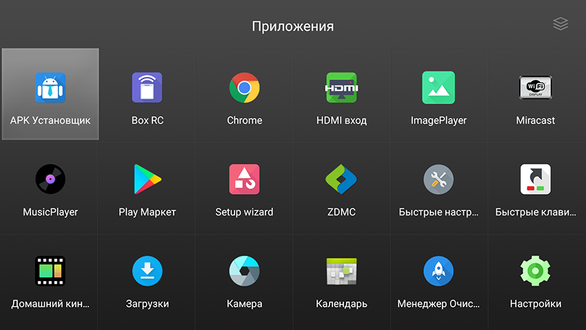 В чистой системе только самые важные приложения, ничего лишнего. Перечислю некоторые программы: Google Play, Chrome, Image Player, Miracast, HDMI вход, Music Player, ZDMC, Настройки, Быстрые настройки, Проводник.