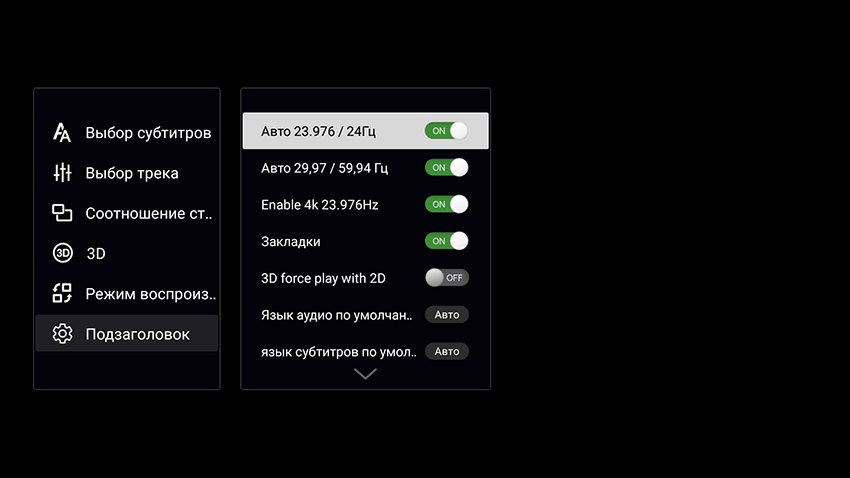 Плеер> Автофреймрейт, Выбор внутреннего плеера для потоков, Регион Bluray, Данные на LED панели