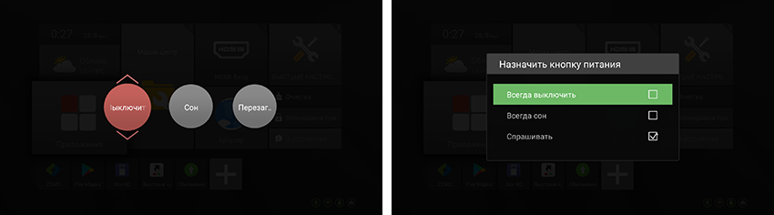 При нажатии кнопки питания на пульте появляется выбор действия. При длительном нажатии можно выбрать действие по умолчанию.
