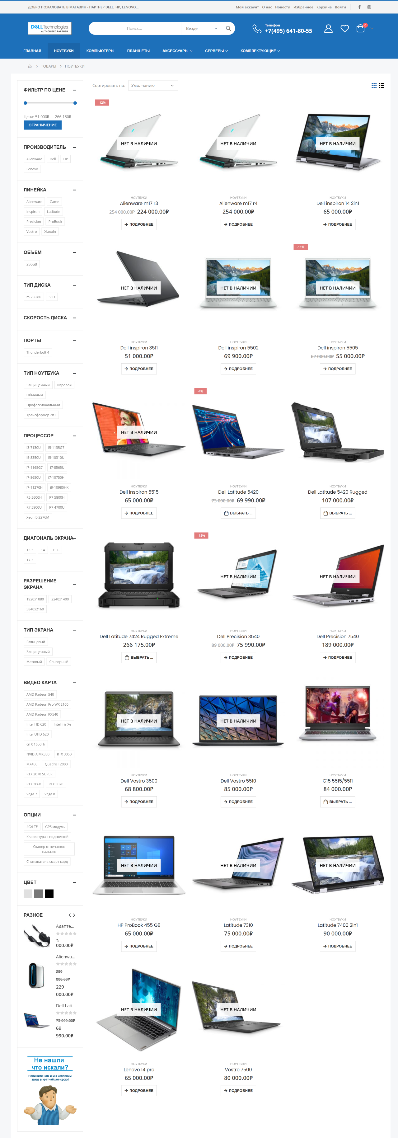 Система фильтров в каталоге есть, что приятно. Вот только проку от нее, признаться, не очень-то много. Возьмем для примера раздел с ноутбуками. Первое, что бросается в глаза — присутствие в списке нескольких позиций, которых нет в наличии. При этом отфильтровать товары по наличию нельзя… Или вот, например, объем диска: фильтр есть, но опция в нем всего одна — можно выбрать только ноутбуки с диском 256 Гб. Ну и так далее.