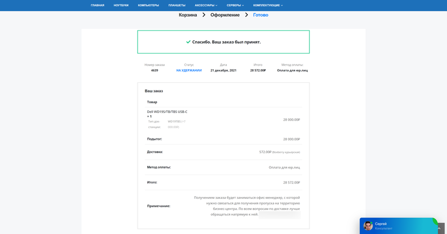 Это сработало — уже через 6 минут менеджер магазина прислал счет. Очень оперативно, надо отметить. Спустя пару часов счет был оплачен, платежное поручение выслано сотрудникам магазина. Осталось дождаться доставки товара.