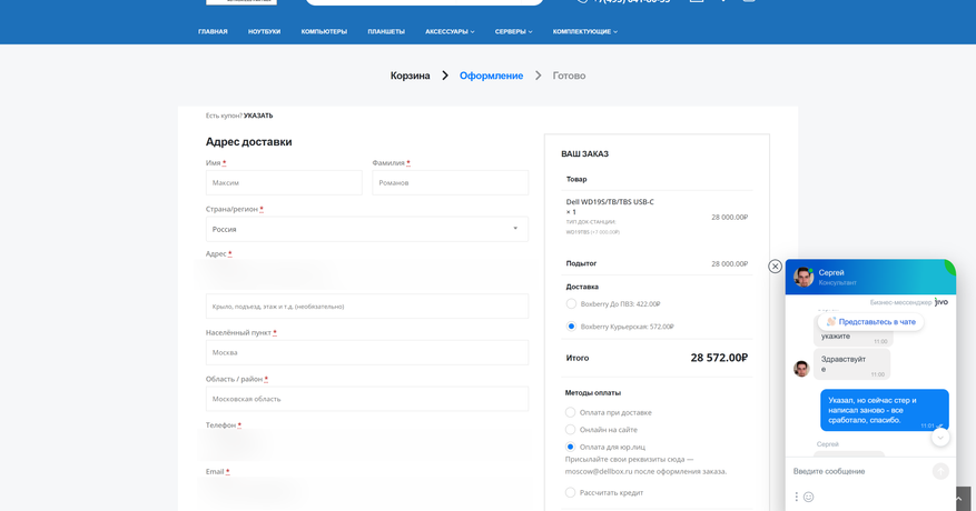 С вводом адреса произошла неприятная неожиданность — сайт никак не хотел принимать слово «Москва» в качестве населенного пункта. Мы даже обратились в чат с этой проблемой — больше, конечно, не за реальным советом, а чтобы выяснить, через сколько нам ответит оператор. Ответил он через 3 минуты, к тому времени мы уже ввели название города заново, воспользовались «всплывающей» подсказкой — и все заработало. В качестве метода оплаты был выбран «безнал» от юрлица.
