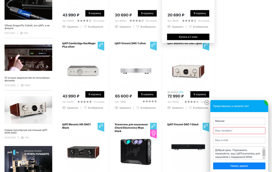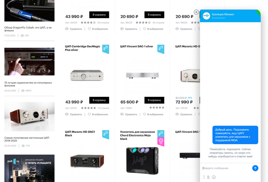 Магазин «Пульт.ру» гордится своими консультантами и часто делает акцент на их профессионализме в промоматериалах. Ответы сотрудников магазина на вопросы пользователей, заданные в карточках товара и в форуме, а также подготовленные обзоры вполне подтверждают, что свое дело они знают. При случае мы обязательно посетим салоны и комнаты прослушивания магазина, а заодно — вдоволь пообщаемся с менеджерами. Пока же было решено воспользоваться «экспресс-вариантом» и проверить, как работает чат на сайте. Зачастую такой формат консультации оказывается намного более удобным, чем по телефону — например, можно сразу получить ссылки на рекомендуемые товары.