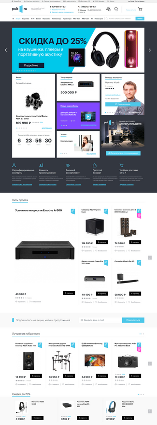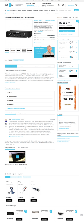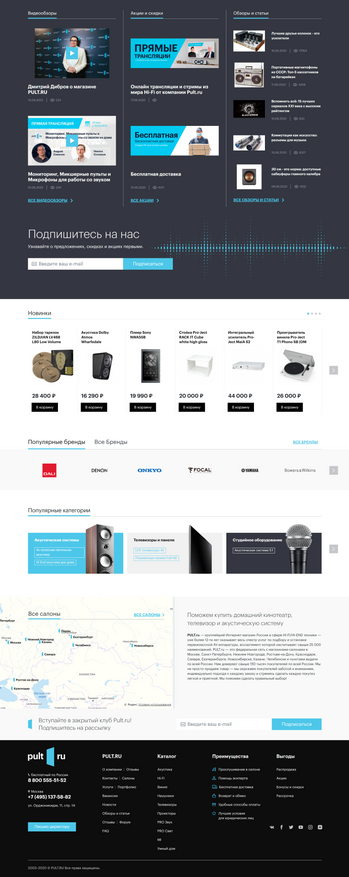 Сайт магазина, расположенный по адресу https://www.pult.ru, презентабельно выглядит, хорошо сверстан и крайне информативен, к чему мы еще вернемся. По традиции, первым делом подробно разберем наполнение главной страницы. Она рассчитана на довольно длительный скроллинг, потому отдельно рассмотрим верхнюю и нижнюю часть, иначе скриншот получится слишком «длинный» и малоинформативный.