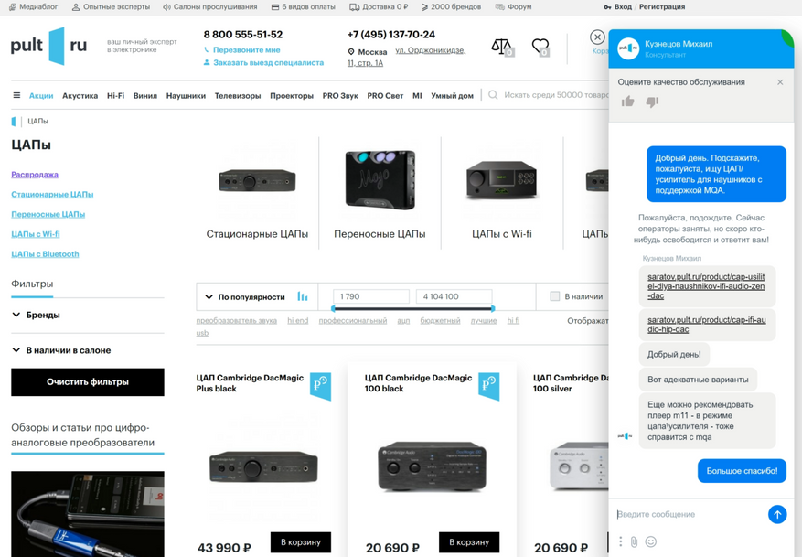 Вопрос был сформулирован совершенно случайно — что первое в голову пришло. На момент начала разговора была открыта страница каталога с ЦАПами, потому решено было попросить менеджера порекомендовать ЦАП/усилитель для наушников с поддержкой MQA.