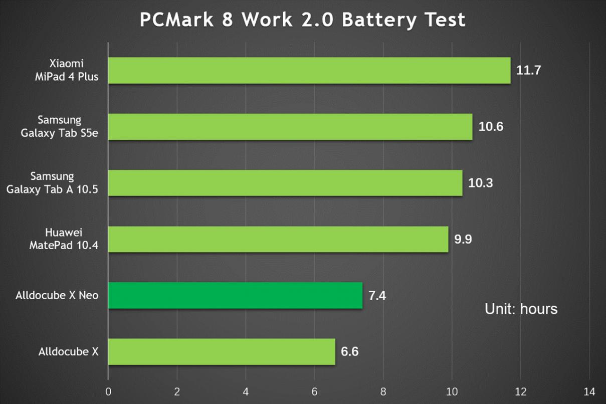 При яркости дисплея и громкости динамика, настроенных на 50%, X Neo набрал 7 часов и 25 минут в тесте батареи PCMark 8 Work 2.0, по сравнению с другими планшетами среднего класса не впечатляющие показатели.