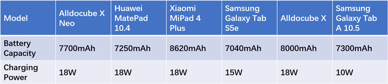 В Alldocube X Neo встроена литий-полимерная батарея емкостью 7700 мАч, что меньше, чем у X (8000 мАч). Но с гораздо более эффективным процессором X Neo может дать около 7-8 часов экранного времени при полной зарядке, в то время как X только около 6 часов.