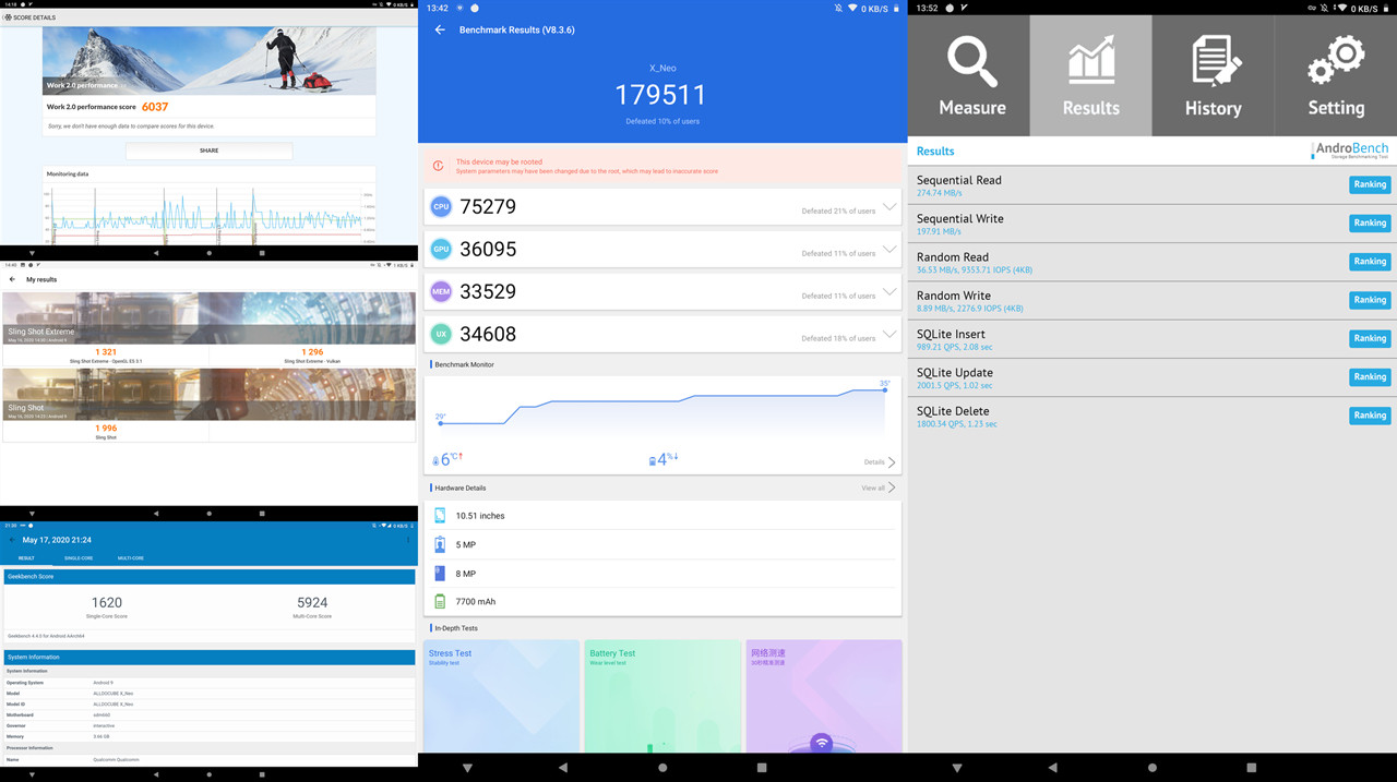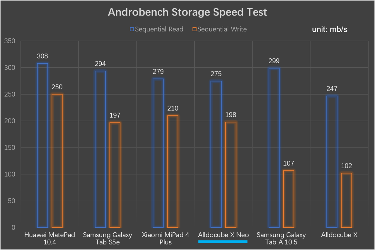 Встроенное хранилище — eMMc 5.1, которое конечно не сравнится с хранилищами UFS, но X Neo в тесте Androbench удалось получить результаты скорости работы с памятью, не хуже чем в более дорогих планшетах среднего класса, таких как Samsung Galaxy Tab S5e.